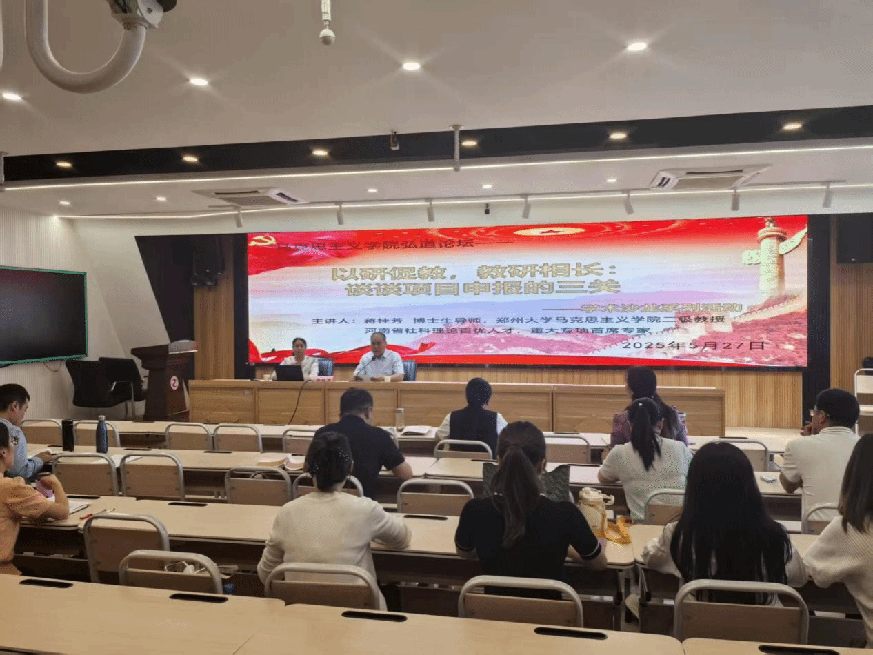 5 月 27 日,马克思主义学院在文博楼 B309 会议室召开 “以研促教,教研相长” 学术沙龙活动。活动特邀郑州大学蒋桂芳教授莅临指导,由马克思主义学院院长任先国主持,学院科研骨干教师参会。