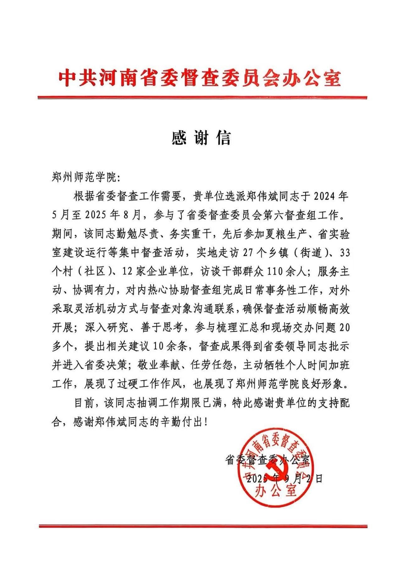2024年5月至2025年8月,根据省委督查工作需要,学校选派郑伟斌同志参与省委第六督查组工作。感谢信称:该同志勤勉尽责、务实重干,先后参加夏粮生产、省实验室建设运行等集中督查活动,督查成果得到省委领导同志批示并进入省委决策,展现了郑州师范学院良好形象。