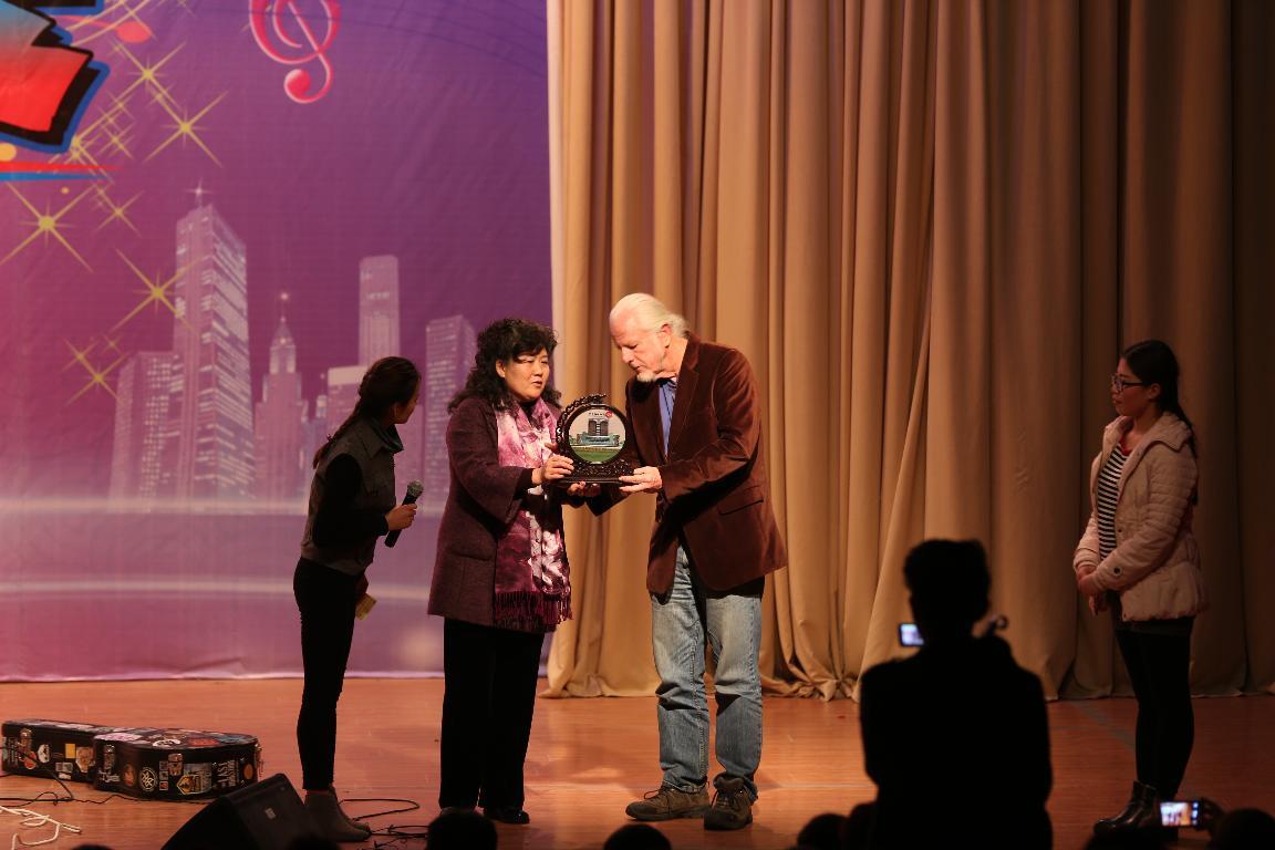 11月10日晚,由省文化厅主办,郑州师范学院协办的美国“尘暴”乐队中国巡演—郑州师范学院站在我校7号楼报告厅精彩上演,副校长蒋丽珠和省文化厅外事处相关领导及我校相关部门负责人、师生代表600余人观看了本场演出。演出开始前,副校长蒋丽珠代表我校向乐队负责人赠送了礼品。