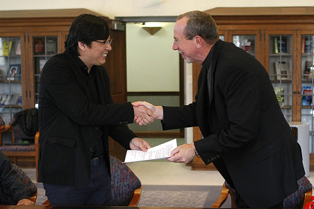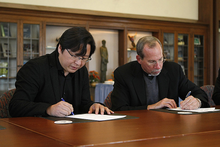 美国东部时间10月8日下午三点,在赵健校长的授权下,我校国际合作与交流处处长许红伟博士与美国泽维尔大学校长:MichaelJ.Graham.S.J.教授在美国辛辛那提市,泽维尔大学校长会议室正式签订了友好合作协议,双方约定未来将在蒙特梭利教育模式认证,教师和学生培训、互访,孔子学院建设等方面开展深度合作!当天,泽维尔大学执行校长:Scott A.Chadwick博士主持了签字仪式!泽维尔大学国际部负责人、特殊教育学院院长、国际教育学院院长及蒙式教育负责人、知名教育电视制片人李新萍等参加了签字仪式。
