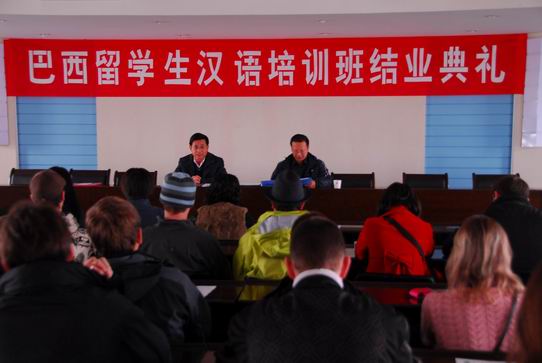 2008年12月12日上午10:30,我校第二批巴西留学生汉语培训班结业典礼在行政楼401会议室隆重举行。校长赵健、副校长周静宇、外事处处长李坤陶以及外事处工作人员、留学生汉语培训班各任课老师、全体留学生出席了此次典礼。典礼由外事处处长李坤陶主持。