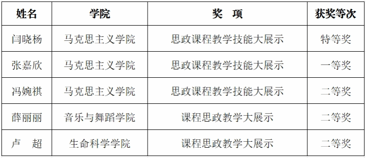 此次大展示分为思想政治理论课教学技能大展示和课程思政教学展示。在为期3天的激烈角逐中,共有来自36所郑州地方高校的132名选手参加角逐。我校马克思主义学院闫晓杨老师、张嘉欣老师、冯婉祺老师分别斩获思政课程教学技能大展示的特等奖、一等奖和二等奖;音乐与舞蹈学院薛丽丽老师、生命科学学院卢超老师荣获课程思政教学大展示二等奖。我校荣获“思政课程突出贡献单位”。