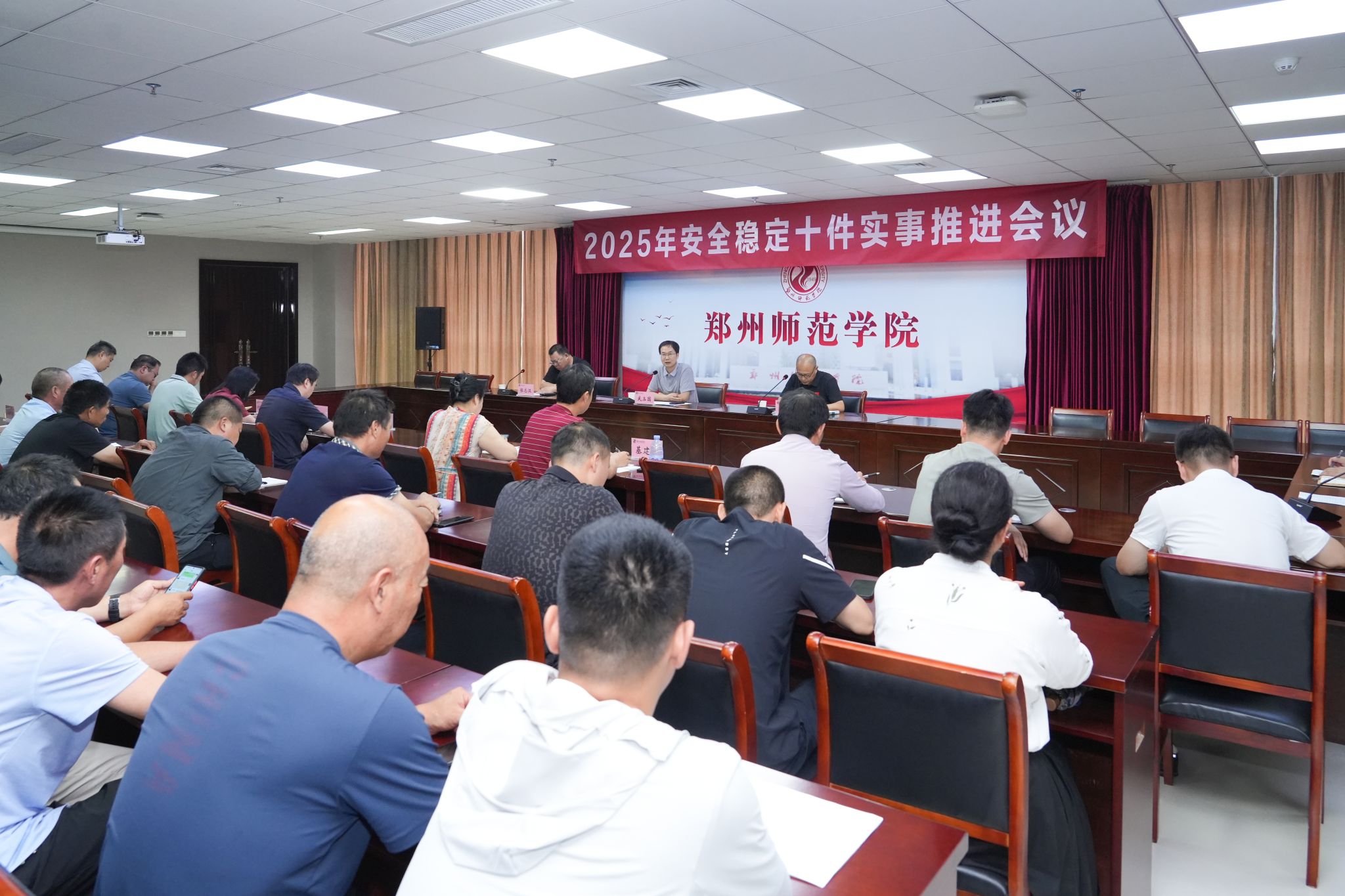 7月17日上午,2025年安全稳定十件实事推进会议在综合楼十二楼第一会议室召开,副校长武玉国、党政办、纪委、财务处、审计处、基建处、国有资产管理处、后勤处、保卫处相关人员参加了此次会议。
