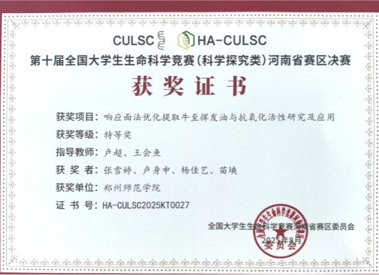 全国大学生生命科学竞赛是教育部认定的国家A类竞赛中覆盖面最广、影响力最大的生命科学领域学科竞赛。本届竞赛规模空前,全国共有695所高校、2.1万余支队伍参与角逐,参赛学生突破8万人次,创下赛事历史新高,最后产生一等奖494项(占比2.31%)。在河南省赛区,郑州大学、河南大学等29所高校的1029支队伍同台竞技,最终137支队伍晋级河南省决赛。我校生命科学学院高度重视、精心组织,聚焦生命科学前沿研究与产业应用热点,在项目选题、实验设计、数据分析、成果凝练等环节反复打磨和优化提升。卢超、王会鱼老师指导的2022级中药资源与开发专业学生团队(张雪婷、卢身申、杨佳艺、苗塽)最终凭借严谨的科学态度、创新的解决方案赢得了评委专家的一致认可,成功斩获河南省特等奖,并取得全国一等奖的好成绩。