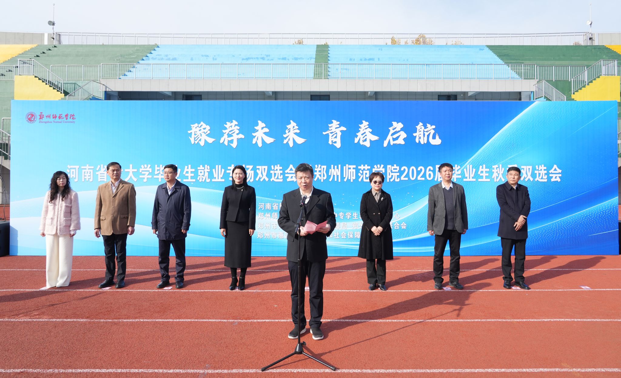 11月14日上午,“豫荐未来 青春启航”河南省女大学毕业生就业专场双选会暨郑州师范学院2026届毕业生秋季双选会在学校东校区运动场举行。河南省教育厅学生工作处处长李班、郑州师范学院校长张铟、河南省教育厅学生工作处四级调研员钱鹏俊、郑州市妇女联合会党组成员、副主席刘欣等出席活动。