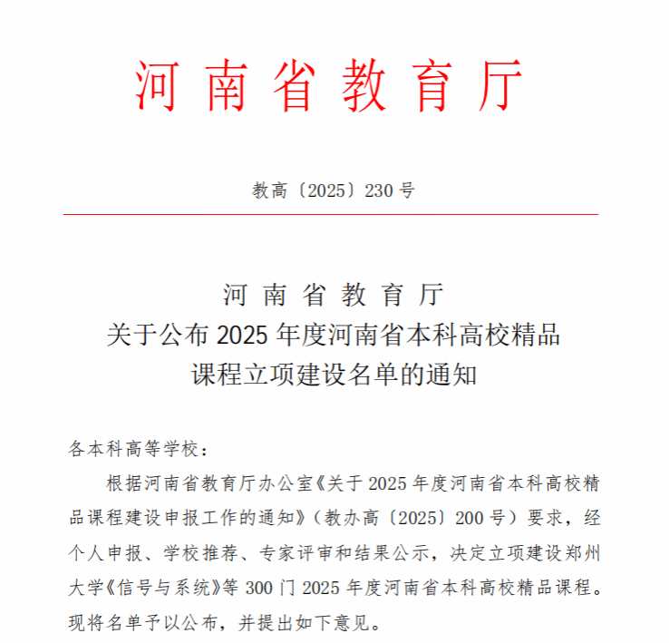 近日,河南省教育厅发布了《关于2025年度河南省本科高校精品课程立项建设名单的通知》(教高〔2025〕230号),我校共有4门课程成功获批立项,涵盖智慧课程、通识教育精品课程、研究性教学精品课程三大类别,为学校教育教学改革注入新活力。