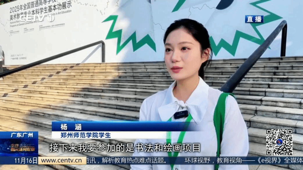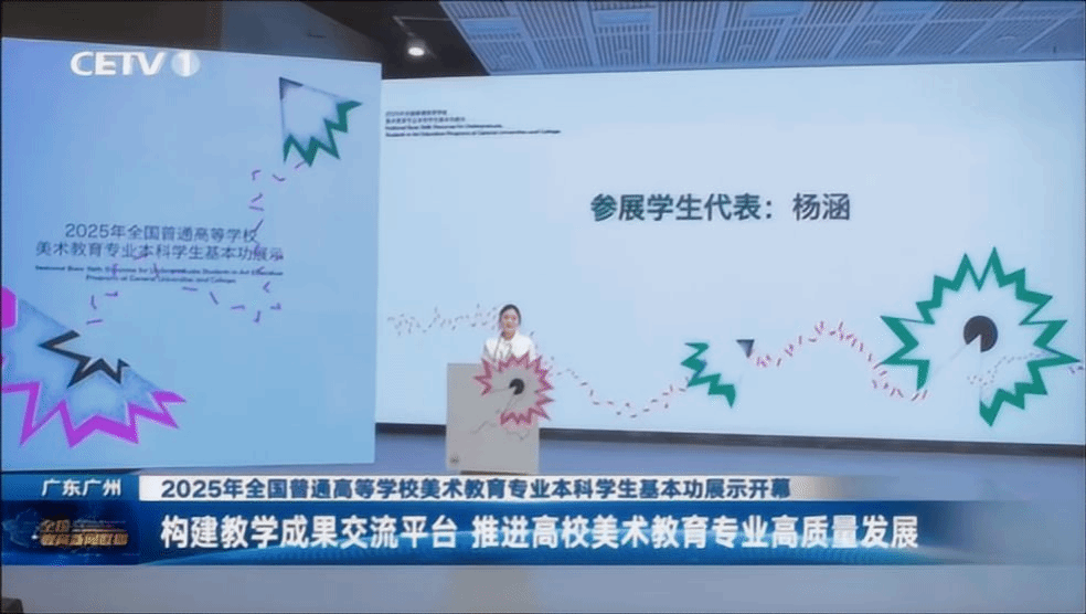 我校对此次展演活动高度重视,提前半年启动专项培训,从课程打磨、教学技能和专业水平提升到综合素养强化,为参赛师生提供了系统且精准的指导。赛事期间,我校师生表现优异、屡传佳讯:学生杨涵因综合素养突出,受教育部邀请作为学生代表在开幕式发言,并接受了中国教育电视台的现场采访;在教学展示(微课)环节,全国共遴选出10项优秀案例进行现场展示,朱雨瑄、杨涵、于宁怡三位同学作品悉数入选;在专业技能展示环节,美术学院教师沈梦杰与于宁怡同学的作品获评优秀案例,并入选现场优秀作品展出。