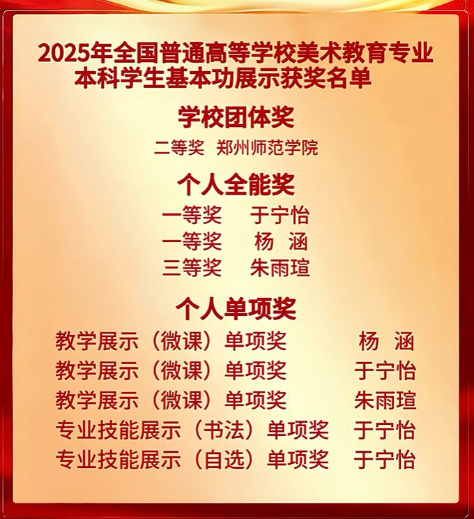 本次活动在直观展现我校师范类人才的培养质量和我校教师教学水平及审美素养的同时,还为推动“一专多能”美术教育培养目标的落地实施提供实践依据。此次全国赛事佳绩的取得,既是对我校美术教育专业教学质量的一次集中检验,更是学校长期重视美术教育工作、夯实师范生核心能力的显著成效。
