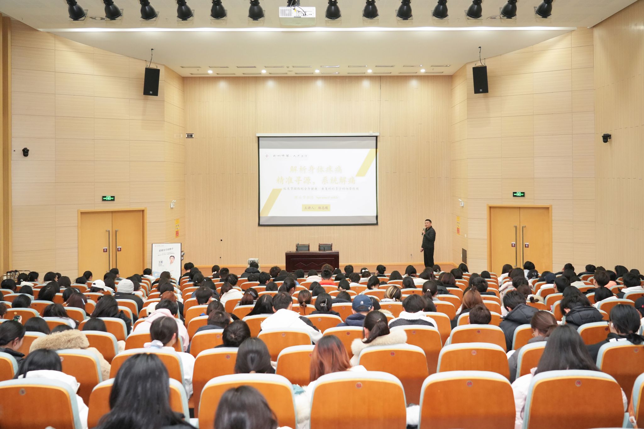 讲座设置互动环节,师生们围绕“运动后肌肉酸痛快速缓解”“青少年近视家庭防控”等实际问题提问,两位专家结合临床经验逐一解答,现场气氛热烈。