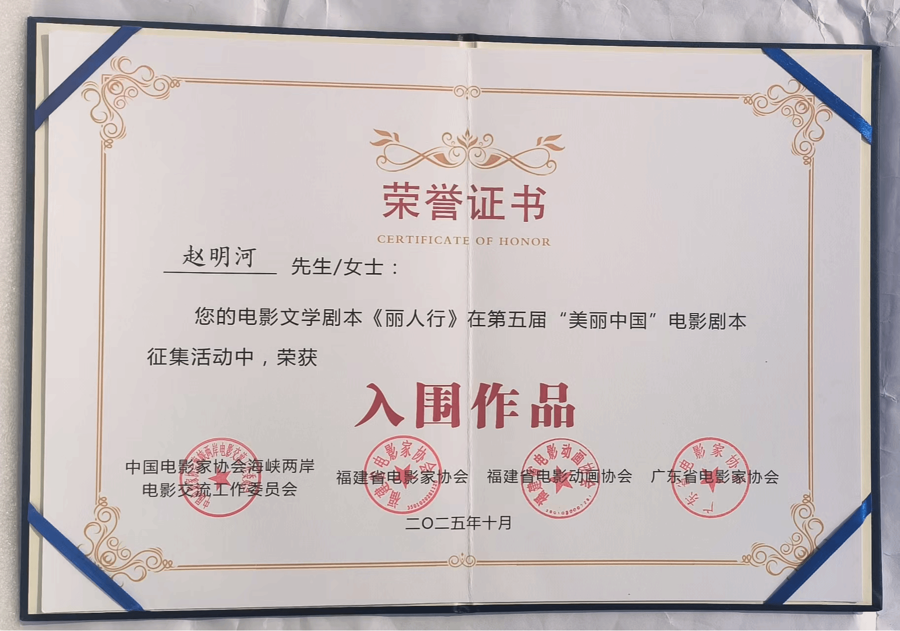 由中国电影家协会海峡两岸电影交流工作委员会、福建省电影家协会、广东省电影家协会联合举办“第五届‘美丽中国’电影剧本征集活动”近日揭晓。我校教师赵明河以笔名日月河创作的电影剧本《丽人行》获入围作品奖。