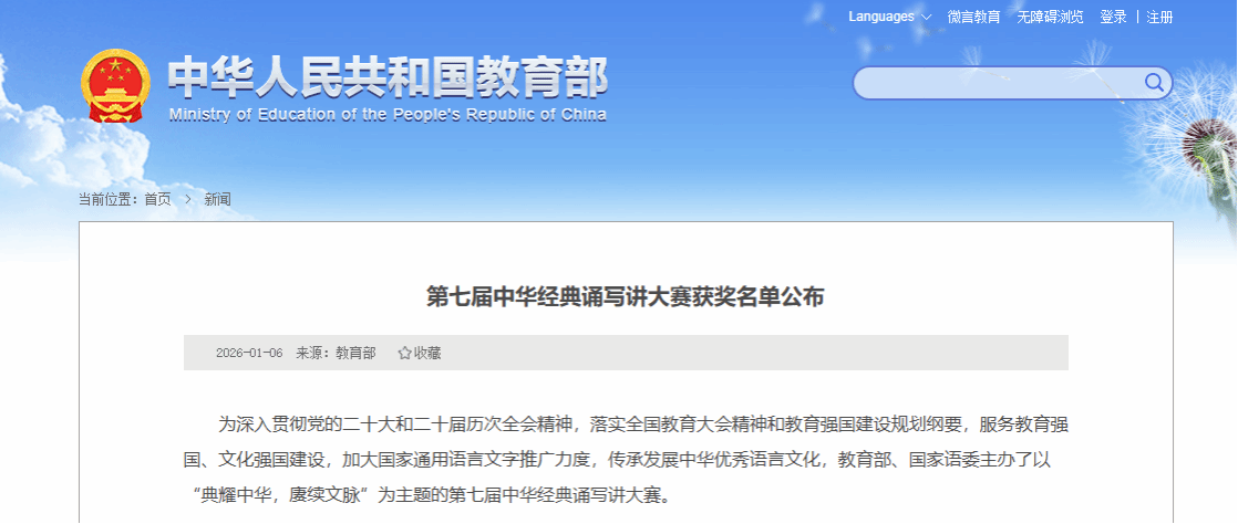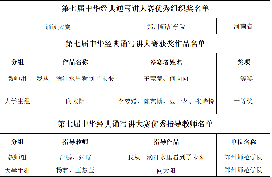 近日,中华经典诵写讲大赛执委会发布《关于第七届中华经典诵写讲大赛优秀组织奖拟获奖单位及个人名单的公示》(赛执委函〔2025〕36号),我校荣获优秀组织奖,我校教师组作品《我从一滴汗水里看到了未来》(参赛者:王慧莹、何向向)和大学生组作品《向太阳》(参赛者:李梦媛、陈艺博、豆一茗、张诗悦,指导教师:杨君、王慧莹)荣获一等奖,两件作品的指导教师分获优秀指导教师称号。