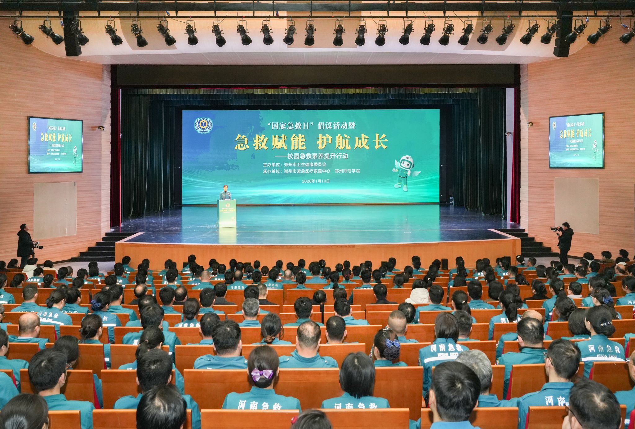 2026年1月10日,由郑州市卫生健康委主办,郑州市紧急医疗救援中心、郑州师范学院共同承办的“国家急救日”倡议活动暨“急救赋能 护航成长”校园急救素养提升行动在我校正式启动。郑州市人民政府副市长李凤芝,河南省卫生健康委医疗应急处处长马高峰,我校党委书记李仰智,郑州市卫生健康委党组书记、主任李卫林,我校纪委书记赵惠玲、副校长武玉国,郑州市紧急医疗救援中心书记、主任赵新珍,郑州市急救网络医院一线人员与师生代表共1000余人参加。