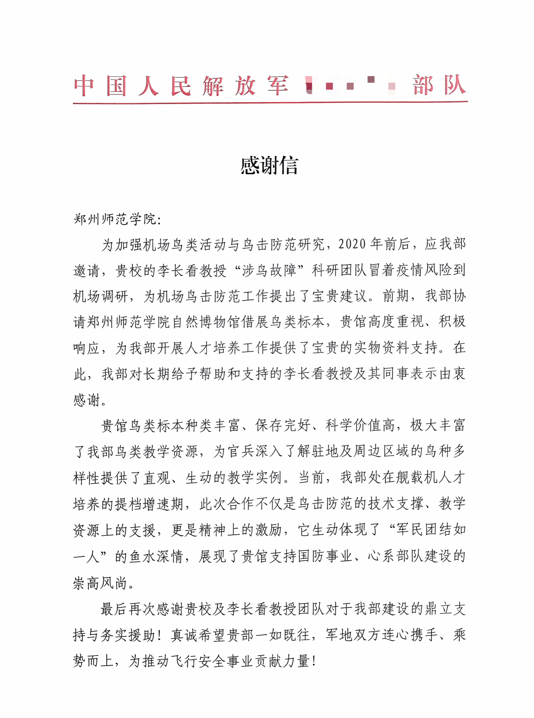 感谢信中指出,为加强机场鸟类活动与防鸟击研究,李长看教授“涉鸟故障”科研团队到机场调研,为机场防鸟击提出专业建议。借展“鸟击”鸟种鸟类标本,为部队开展人才培养工作提供了宝贵的实物资料支持,有力推动了机场防鸟击宣教馆科学化、专业化建设。