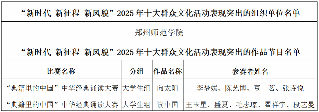 近日,中共河南省委宣传部印发《关于表扬“新时代 新征程 新风貌”2025年十大群众文化活动中表现突出的作品节目、团体个人、组织单位的通报》(豫宣通〔2025〕42号),对在全省系列群众文化活动中表现优异的集体与个人予以通报表扬。我校被评为“表现突出的组织单位”,并成为受表彰的20家单位中唯一的高校,充分体现了我校在群众文化工作中的引领作用和突出贡献。