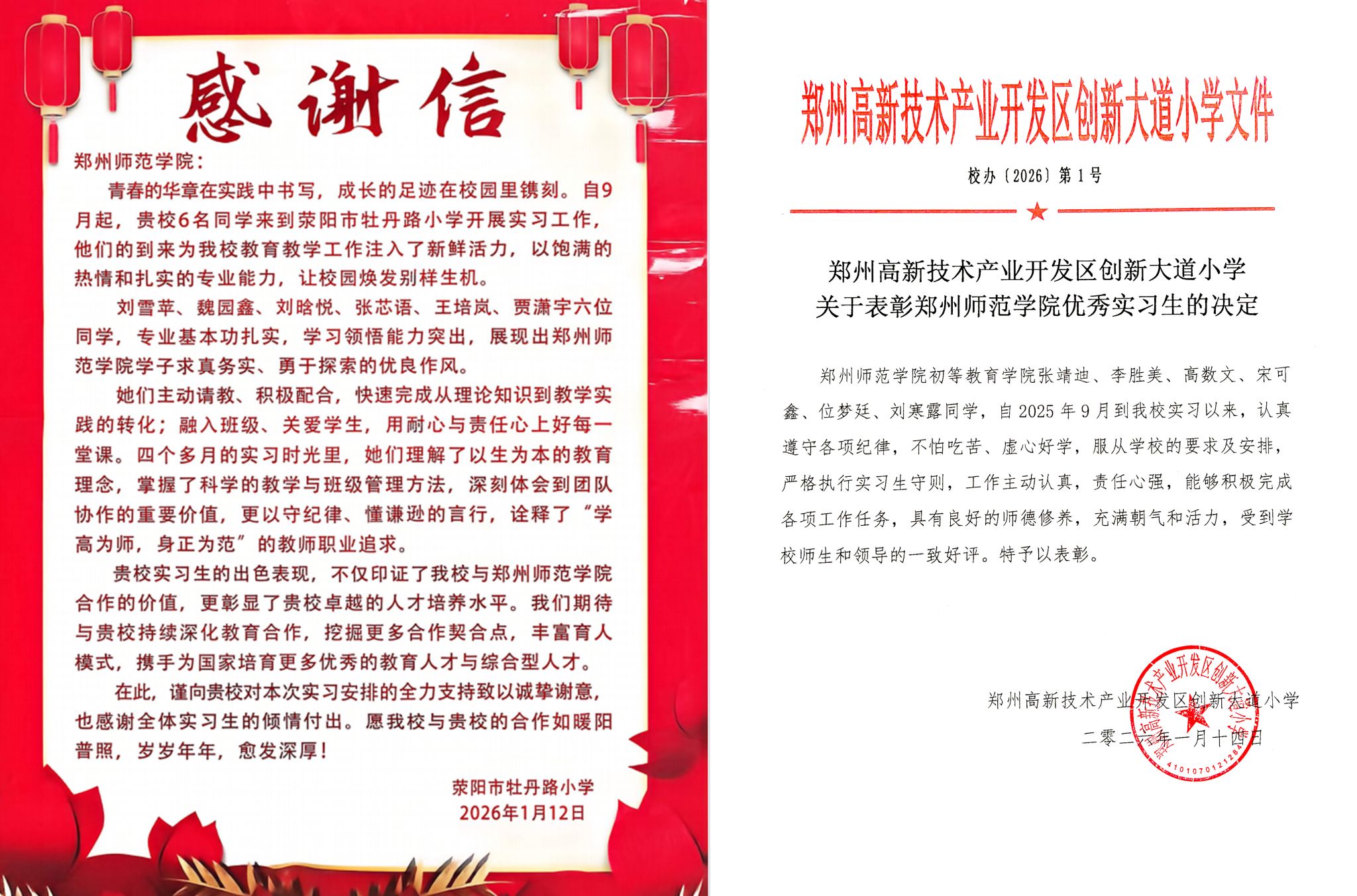 近日,郑州高新技术产业开发区西湖小学、郑州高新技术产业开发区创新大道小学、荥阳市牡丹路小学、荥阳市飞龙路学校等多所学校负责人专程到访我校教育学部送上锦旗和感谢信,高度赞誉我校实习生们过硬的专业素养、扎实的教学能力以及认真负责的工作态度,同时对我校高质量的实践教学工作和人才培养成效给予了充分肯定。