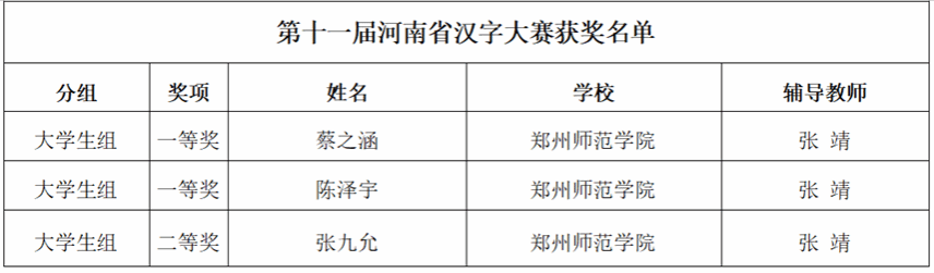 近日,河南省教育厅印发了《关于公布第十一届河南省汉字大赛获奖名单的通知》(教社语〔2026〕23号),我校文学院教师张靖辅导的三名选手在大赛中表现优异,蔡之涵、陈泽宇荣获大学生组一等奖、张九允荣获大学生组二等奖。展现了学校在语言文字教育和传统文化传承方面的扎实功底和优秀人才培养成果。