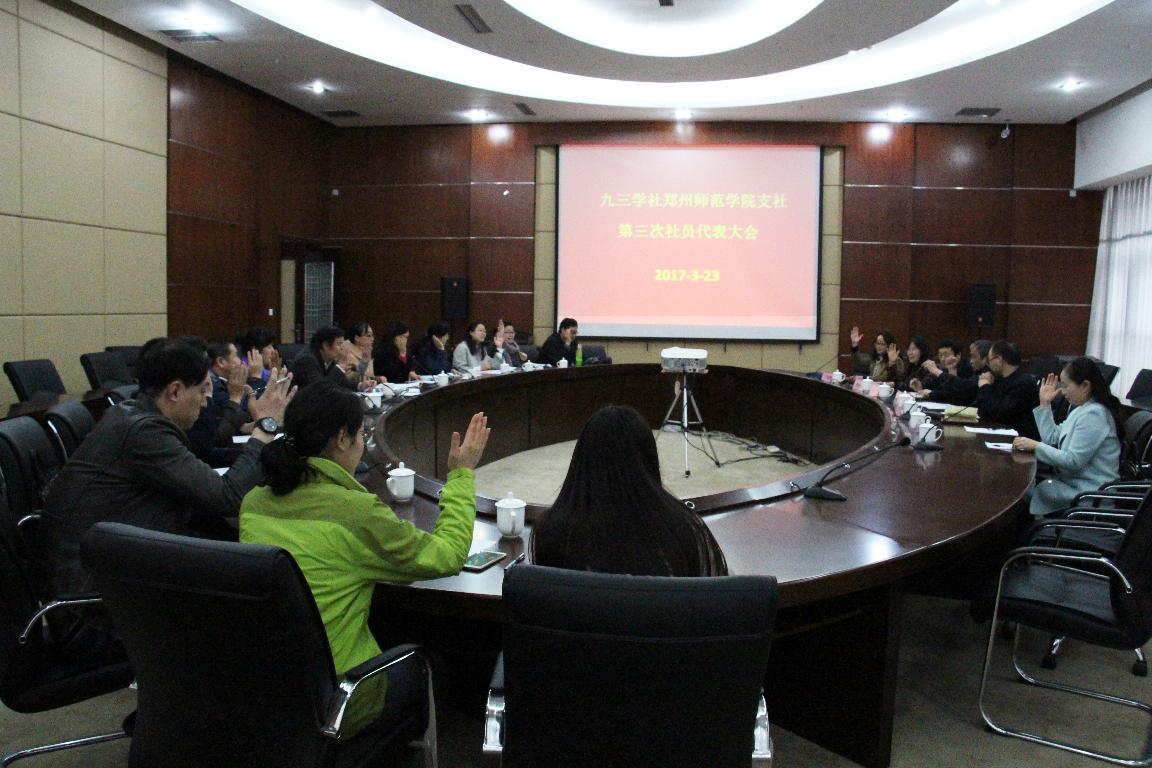 3月23日,九三学社郑州师范学院支社召开换届大会。九三学社河南省委员会组织处处长王治华、党委副书记翟幸福、统战部部长李杰和九三郑州师院支社的全体社员参加了会议。会议由九三学社郑州师范学院委员会主委夏丽华主持。