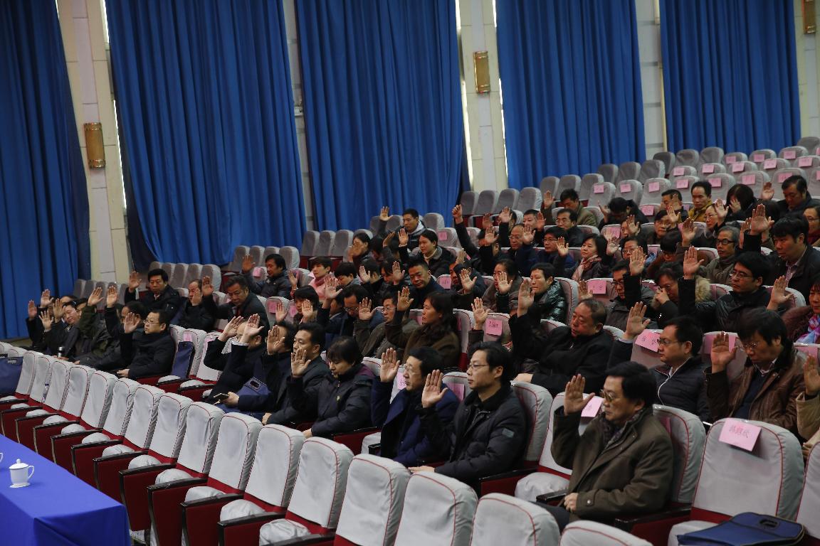 1月14日上午,我校第一届九次教职工暨工会会员代表大会在七号楼报告厅隆重举行。大会主席团成员在主席台就坐。正式代表142名、特邀代表3名、列席代表115名参加大会。