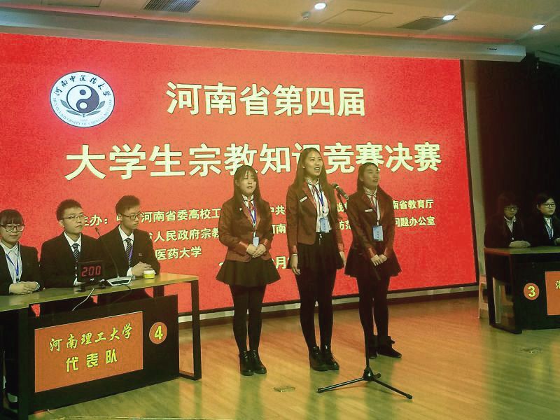 由省委高校工委、省委统战部、省教育厅、省人民政府宗教事业局、省人民政府防范处理邪教问题办公室主办的河南省大学生宗教知识竞赛,已经连续举办了四届。我校每年都认真组织落实校内初赛,选拔优秀选手挺进决赛,并取得了一年比一年优异的成绩。真正把这项赛事举办成了我校的常规教育活动,参与面广、受到教育和锻炼的学生多,使更多的学生认识到掌握宗教知识的重要性,增强了马克思主义宗教观和学法遵法守法用法意识,提高了正确认识和对待宗教问题的能力。