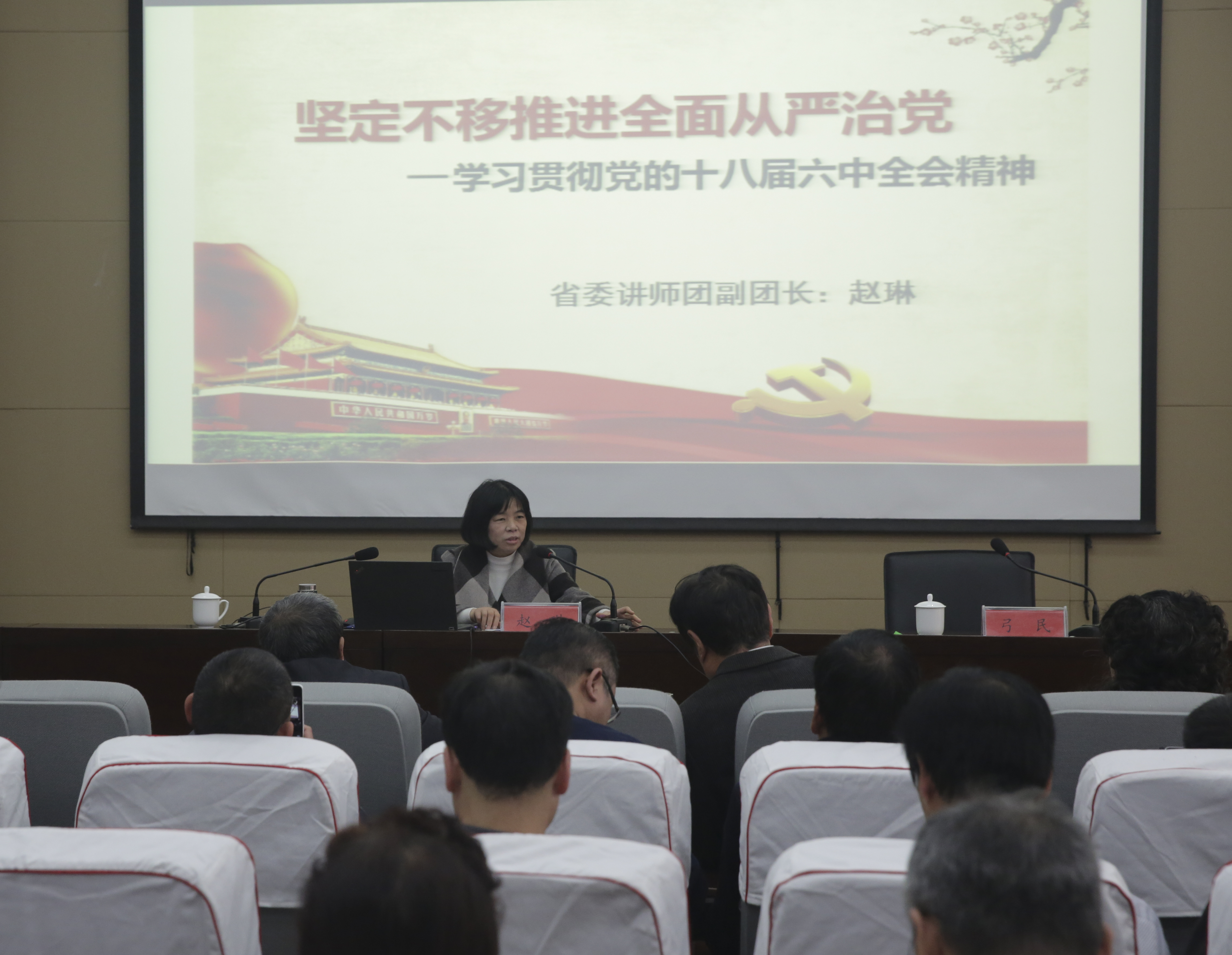 12月6日下午,校党委在图书馆十楼报告厅召开党委中心组学习(扩大)会议,邀请省委讲师团副团长赵琳做题为《坚定不移推进全面从严治党——学习贯彻党的十八届六中全会精神》的专题报告。全体校党委委员及副处级以上领导干部参加本次报告会。报告会由校党委副书记、工会主席弓民主持。