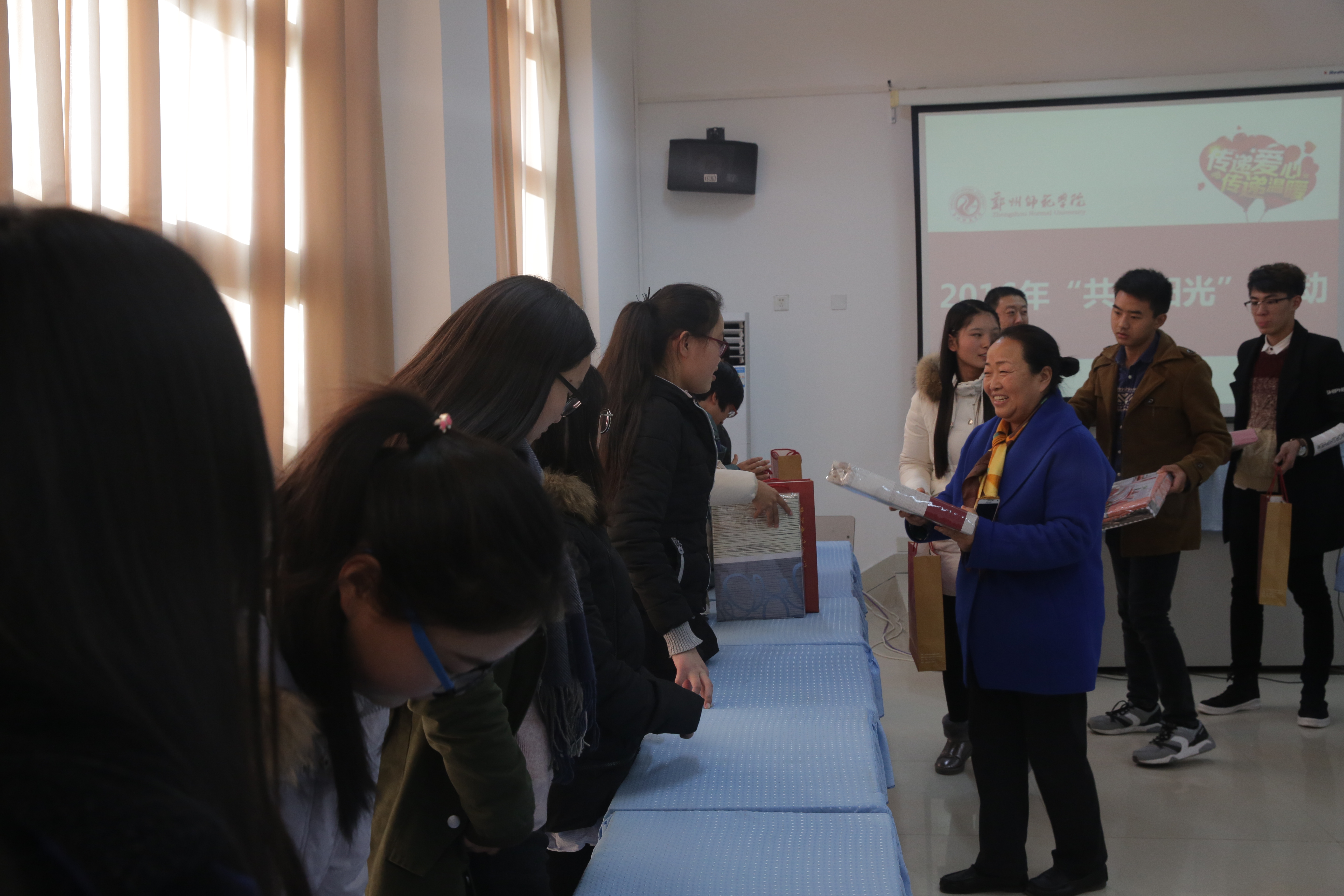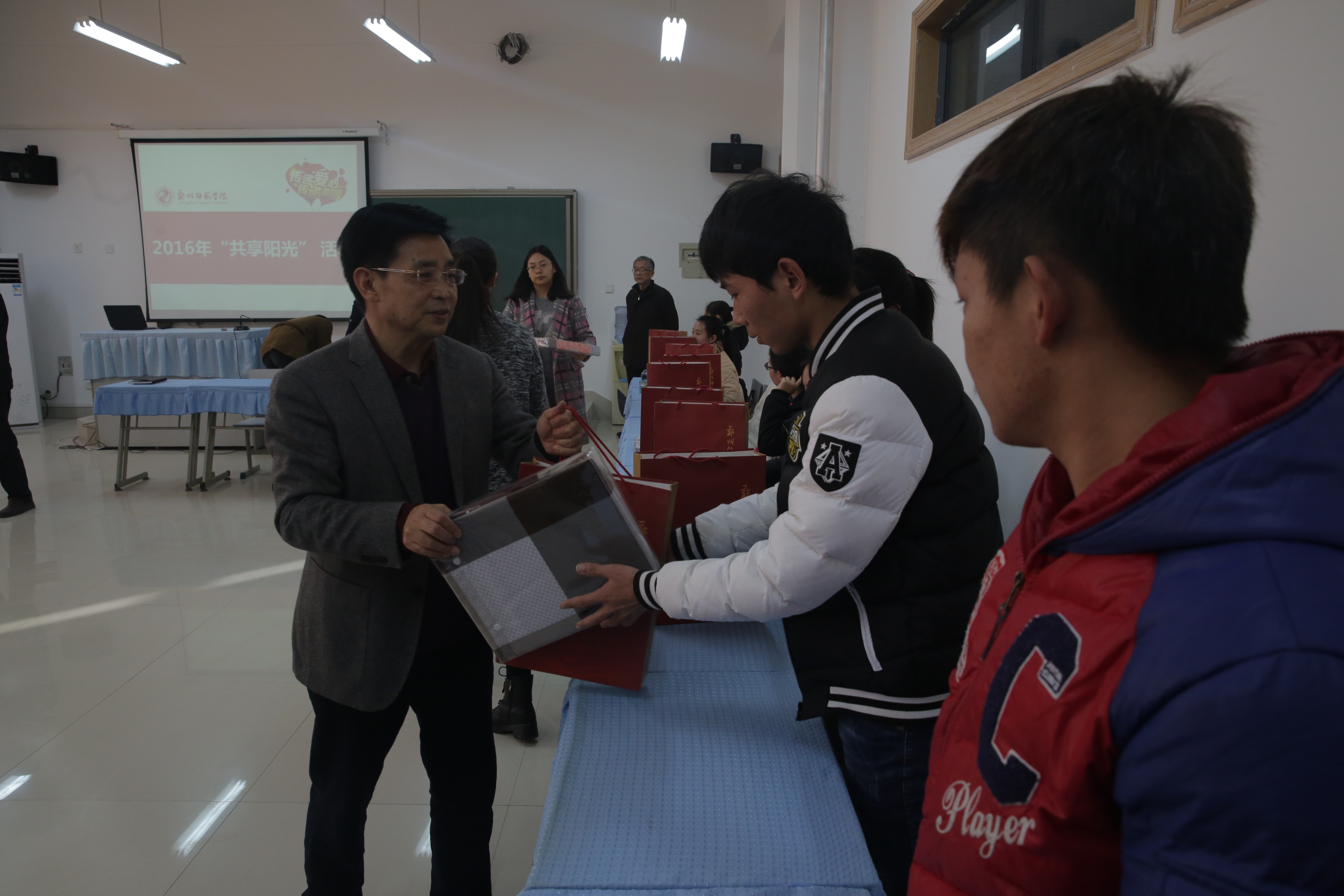 为让我校孤儿感受到集体的温暖和关爱,由学生处主办的2016年“共享阳光”活动于12月6日在经管楼C117举行。学校党委书记于向英、校长赵健出席了此次活动,并向来自15个学院的27名孤儿亲手发放了慰问品,活动由副校长孔青主持。