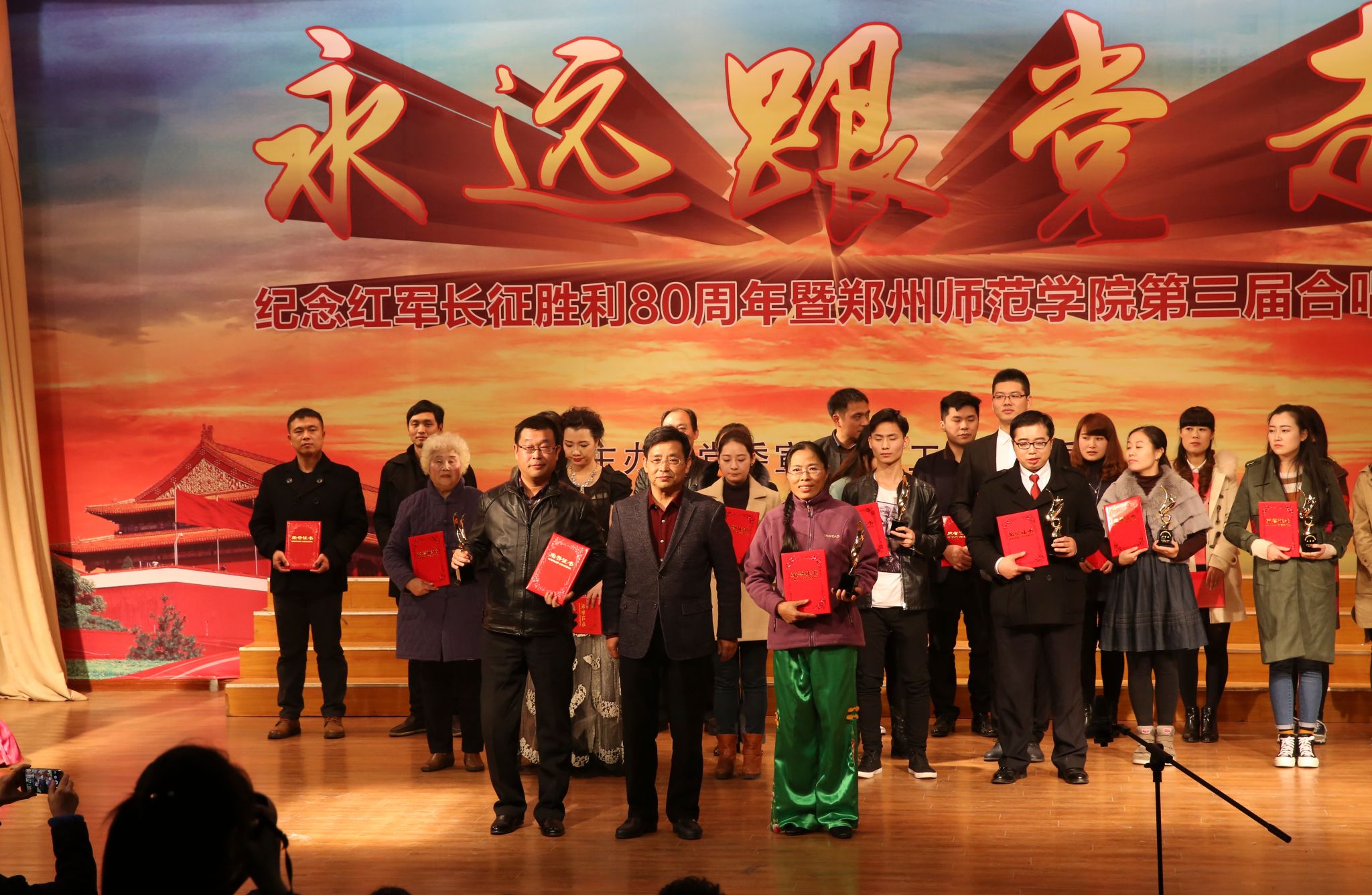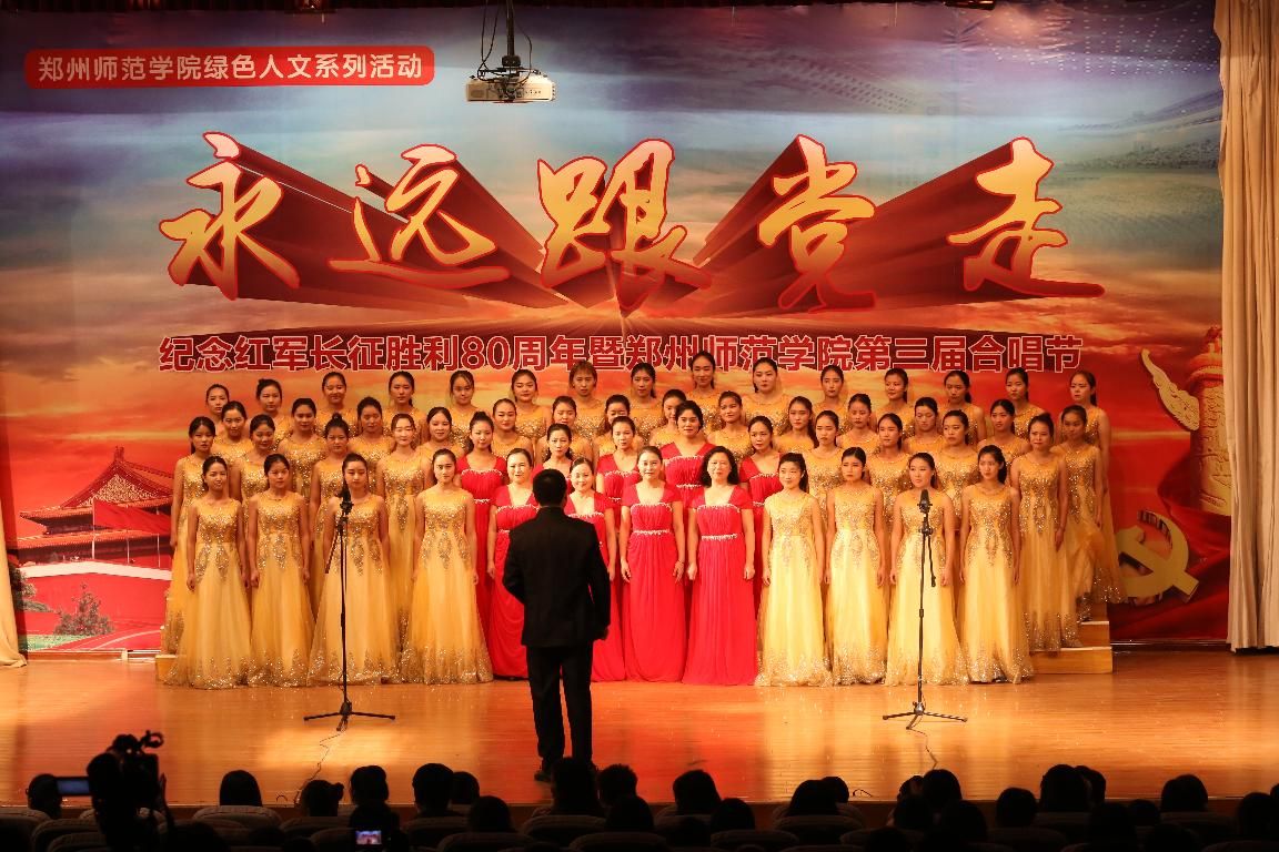绿色人文系列活动——“永远跟党走”合唱节是我校加强思想引领,发挥校园文化育人功能,加强师生爱国主义、集体主义、荣校爱校教育的品牌活动,已连续举办三届。本届合唱节从6月份启动,历时5个多月,参与人次近3000人,活动历时长、覆盖面广、参与率高、活动效果好。全校各单位都高度重视,精心准备,利用课余间隙,组织师生学唱校歌《与中原一同崛起》和弘扬主旋律的歌曲。经过预赛初赛,共有12支代表队进入最后的决赛。经过专家评委们的认真评选,外国语学院、机关党总支获得一等奖;信息科学与技术学院、初等教育学院、信息物流学院、美术学院获得二等奖;历史文化学院、教育科学学院、特殊教育学院、图书馆、政治与公共管理学院获得三等奖,离退休工作处老干部合唱团获特别表演奖。