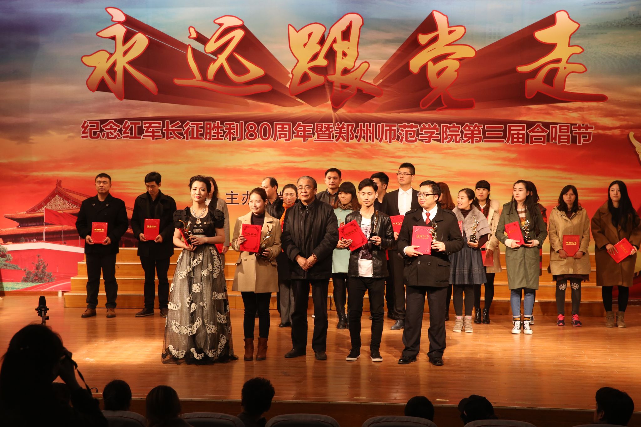 “嵩岳巍巍,黄河汤汤,郑州师院铸辉煌!传承华夏五千年文明,承载教育兴国的希望……”伴着昂扬的旋律,图书馆教师代表队演唱的校歌《与中原一同崛起》拉开了整场演出的序幕。随后,进入本届合唱节决赛的12支代表队依次登台献唱。机关党总支合唱团演唱的《四渡赤水出奇兵》以时而激昂时而细腻的情感,重温了红军二万五千里长征的光辉足迹和奋斗历程,唱出了对祖国、对党的一片深情。政治与公共管理学院带来的歌曲《七律长征》,气势磅礴,将音律与诗情巧妙结合,展现了红军将士不怕牺牲、一往无前的英雄气概。离退休教师演唱的《把一切献给党》表达对党的热爱,以及在党的领导下走向幸福未来的信心和决心。信息物流学院演唱的的《旗帜颂》,表达了全体师生高举旗帜跟党走,不断竞攀高远的决心。《天下乡亲》、《富强之路》、《国家》、《走向复兴》一首首激动人心的“红歌”被演绎得淋漓尽致,把大家带回激情燃烧的岁月,热情唱响了“永远跟党走,共筑中国梦”的主旋律。