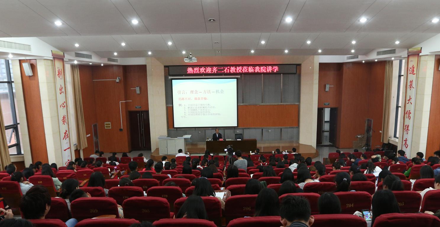 4月20日,天津大学教授齐二石来我校讲学,校长赵健、经济与管理学院全体教师和精益管理专业学生200余人共同聆听了此次讲学。
