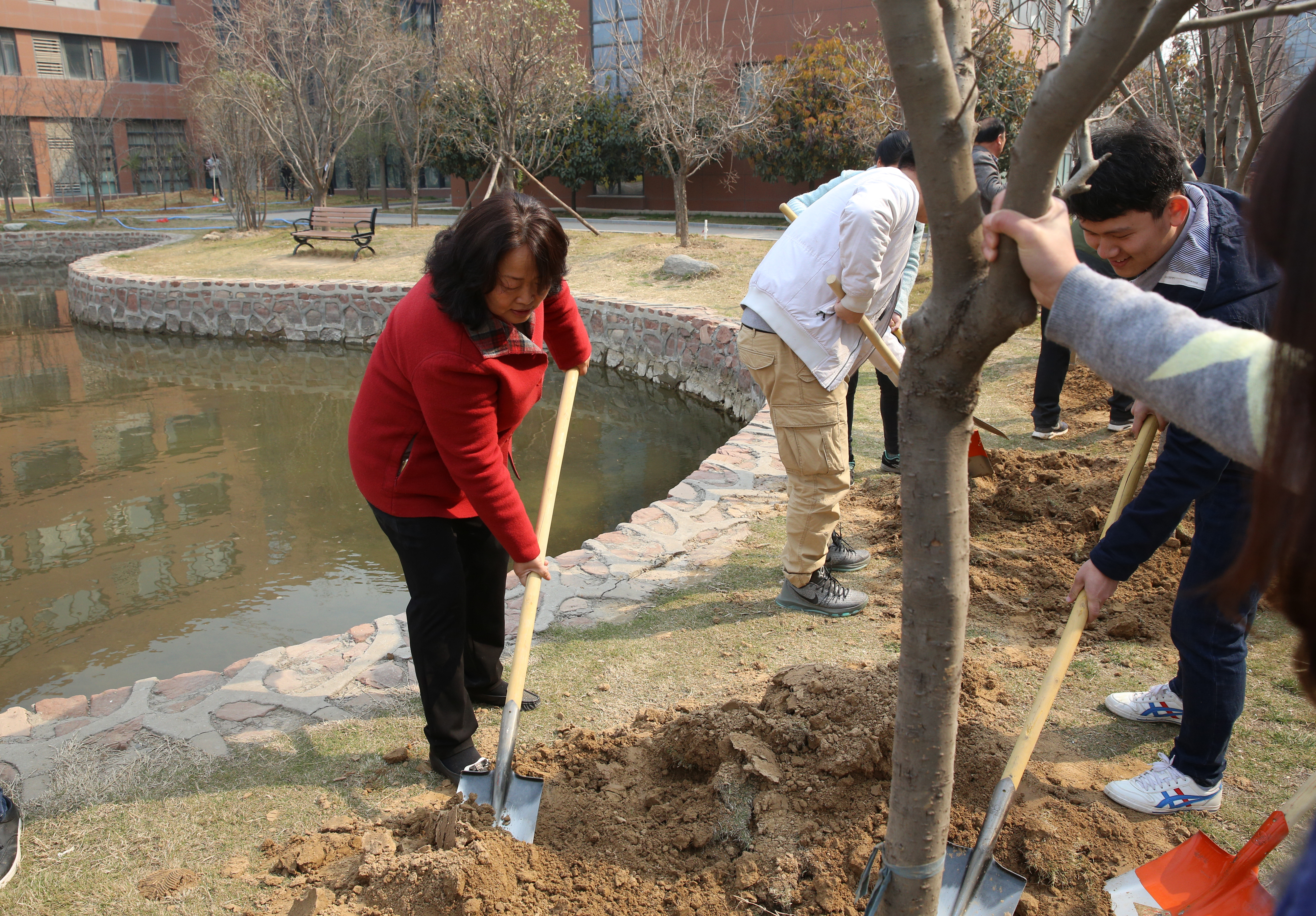 在植树现场,热闹非凡。师生们分工协作,扛苗散苗,挥锹铲土,扶苗踏实,挖坑、栽树、照行、盖土、浇水等各个环节都精心对待,栽得认真,干得卖力,整个植树活动现场一片热火朝天的劳动景象。据统计,这次活动共栽植冬红果、红枫、海棠等观赏树木100余株。