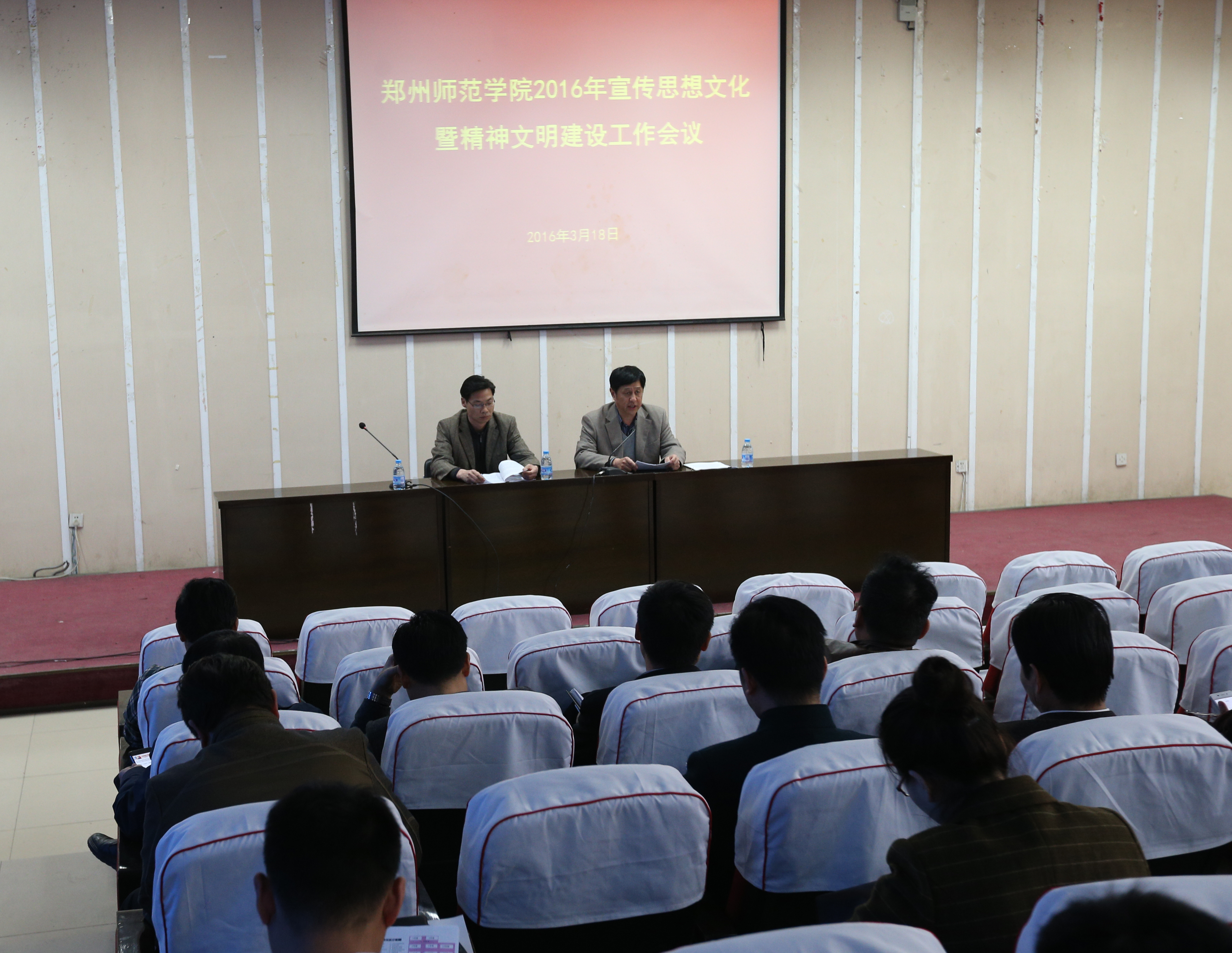 弓民副书记希望,全体与会人员认真学习《中共郑州师范学院委员会2016年宣传思想文化工作要点》《中共郑州师范学院委员会2016年精神文明建设工作要点》《中共郑州师范学院委员会2016年精神文明建设工作实施方案》《中共郑州师范学院委员会关于建立深化全国文明单位长效工作机制的实施意见》和《中共郑州师范学院委员会文明创建先进集体评选办法》等文件精神,抓好落实工作。