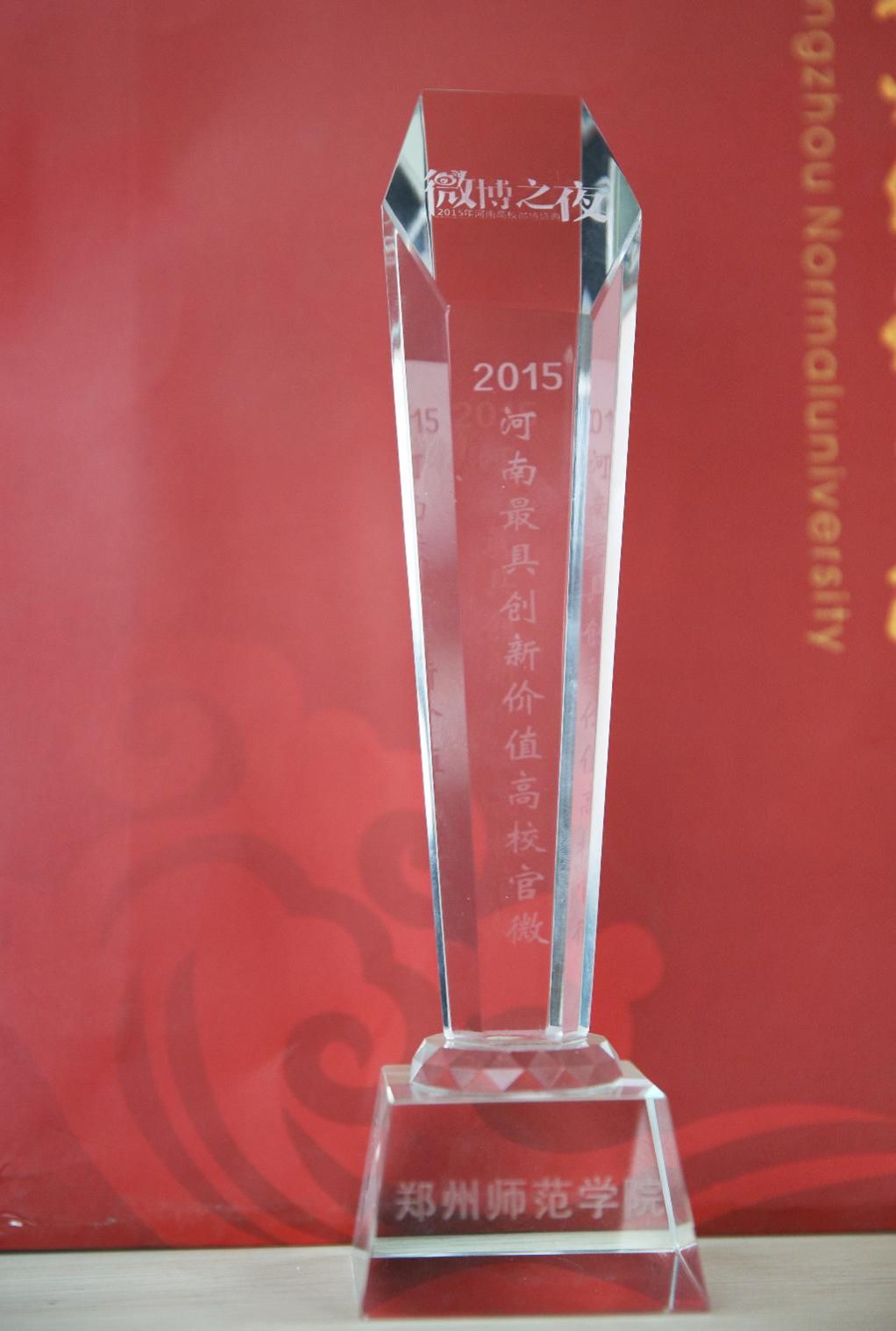 在“微博之夜”庆典会上,新浪微博校园部全国渠道经理刘砚春发布了《2015年河南高校微博年度发展报告》,微博校园河南城市主管陈奕霖讲述了河南高校微博协会品牌故事,盘点了河南高校年度人物、热门网络事件,同时宣布河南启动微博校园菁英计划,并颁发各类奖项。我校荣获“2015河南高校微博最具创新价值奖”,同时获奖的还有郑州大学、河南大学等高校。
