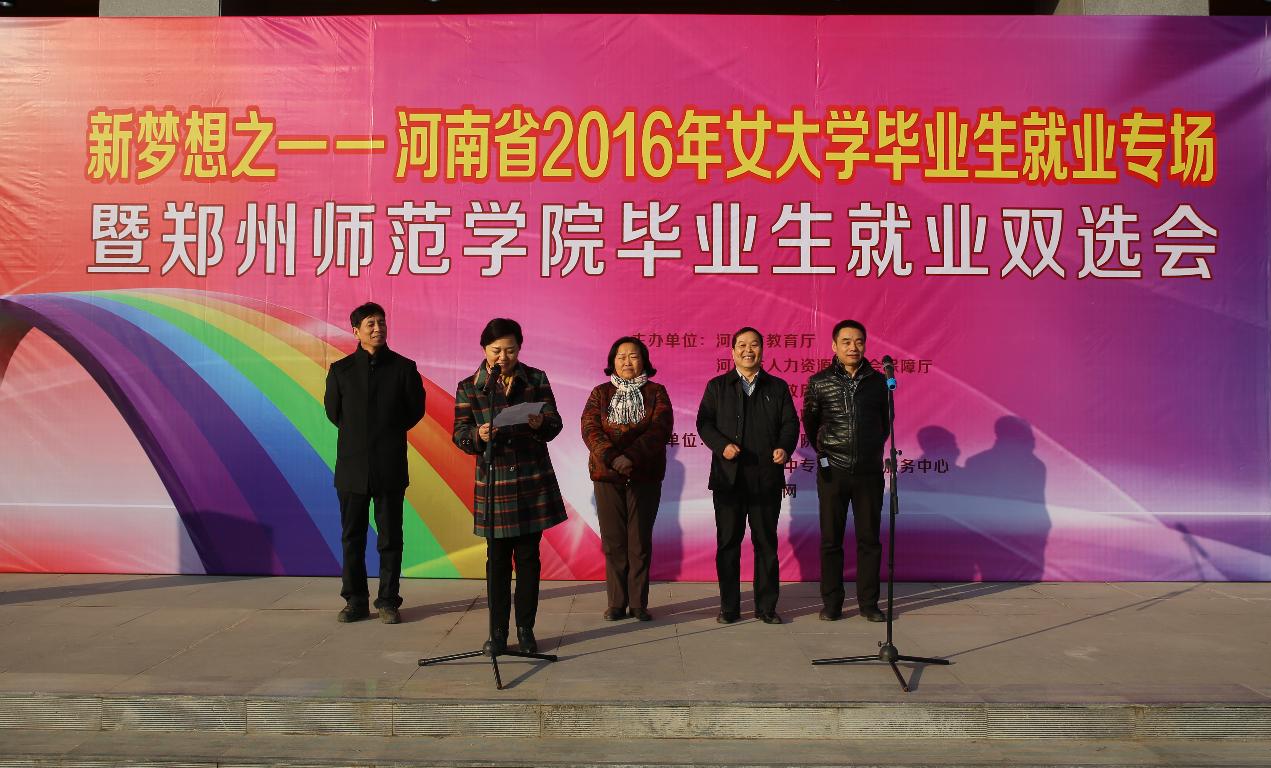 为进一步促进女大学生就业,12月18日,由省教育厅、省人社厅、省财政厅、省妇联等联合举办,郑州师范学院承办的“河南省女大学生就业专场双向选择会”在我校东校区举行。我校2016届毕业生冬季双向选择会同时举行。党委书记于向英、省教育厅大中专学生就业服务中心副主任于华龙、省人社厅就业办孙银正主任参加会议,由河南省妇女联合会发展部部长张俊美主持开幕式。