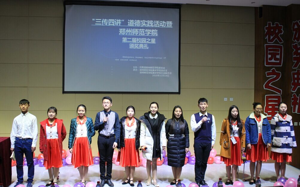 12月18日下午,在西校区特教楼举办了“点亮未来之星,共创人文校园——三传四讲道德实践活动暨郑州师范学院第二届校园之星颁奖典礼”。校党委于向英书记、美术学院负责人、校团委老师及各院系团总支书记均出席了本次活动。