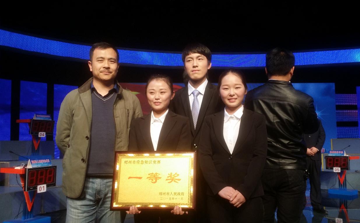 我校保卫处安排专人负责,并在学生中选拔出代表队, 通过培训,参加了日前在郑州电视台录播中心进行的“郑州市应急知识竞赛”,经过 “必答题”、 “抢答题”、“风险题”三种形式六轮的竞赛,我校代表队以扎实的知识基础,沉着冷静的现场发挥,以260分全场最高分摘得竞赛一等奖!