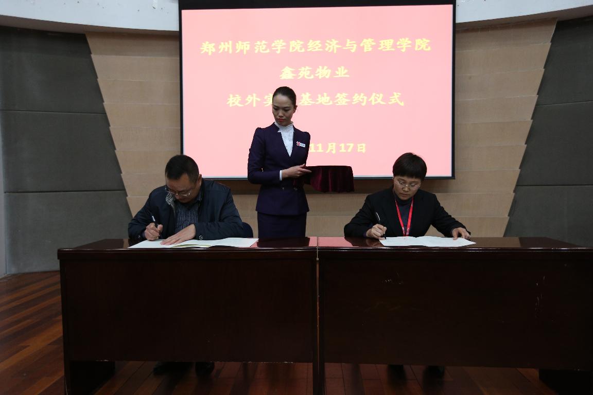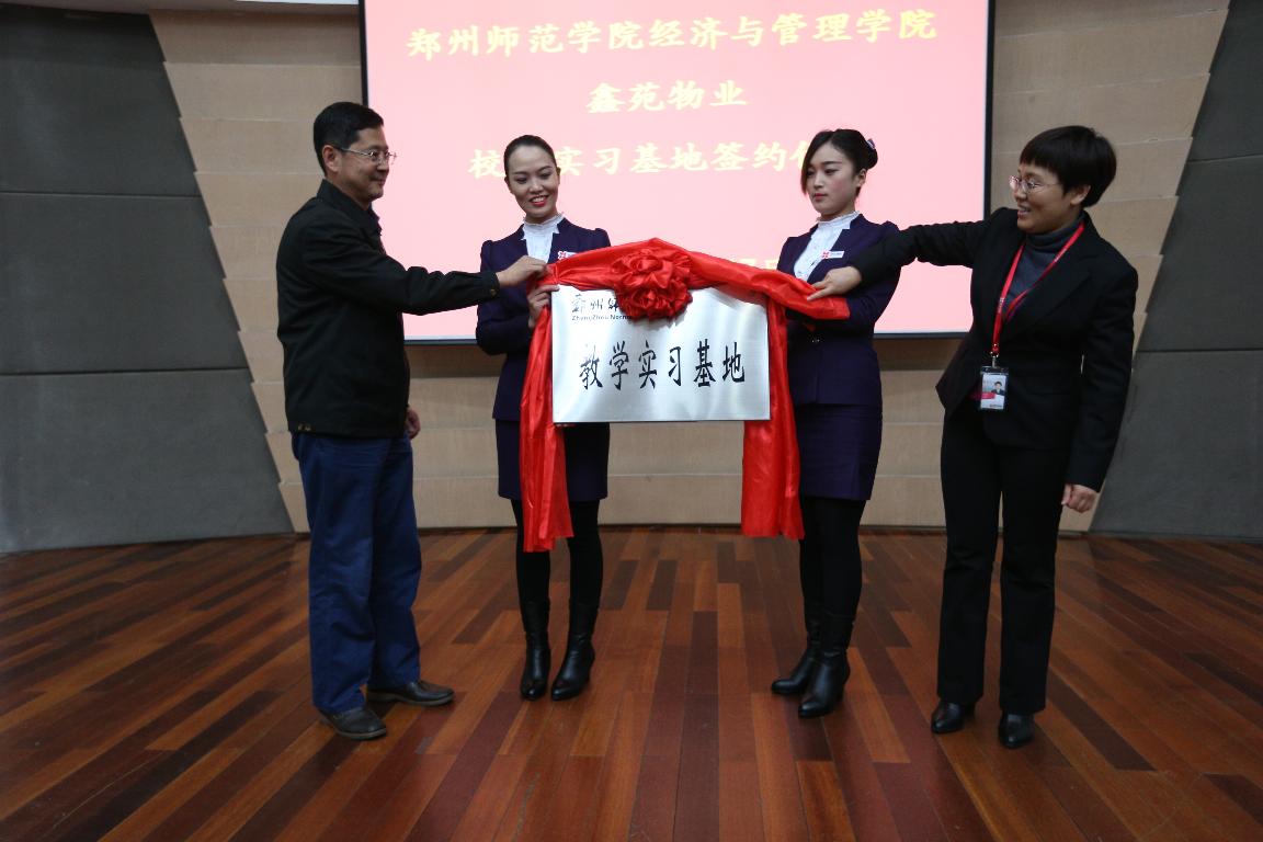 校外实习基地是高校课堂教学的延伸,是高校专业实践教学的重要环节,是高校转型、凝练特色的落脚点,是提高学生综合素质的重要途径。11月17日下午,“郑州师范学院经济与管理学院·鑫苑物业服务有限公司”校外实习基地签约挂牌仪式在鑫苑名家顺利举行。我校纪委书记李树生、鑫苑物业服务有限公司行政总监张蓉、经济与管理学院负责人及鑫苑物业服务有限公司各部门代表和我校师生代表参加此次活动。