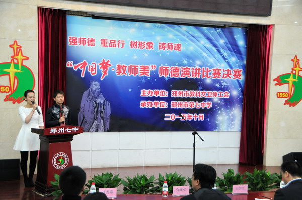 10月30日下午,由郑州市教科文卫体工会主办、郑州七中承办的师德演讲比赛决赛在七中初中部报告厅举行。来自郑州市教育系统的大学、专科学校、中小学及幼儿园等26个单位的选手参加了演讲。担任此次评委的是工人日报驻河南记者站站长余嘉熙,河南省教科文卫体工会副主席王学全,郑州市总工会宣传部长胡忠和,河南省青年艺术编导、郑州市总工会宣教部的陈红松,郑州市总工会艺术编导幺继军。