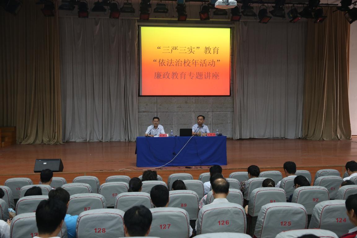 根据校党委工作安排,为全面落实党的十八届四中全会、中纪委五次全会和习近平总书记系列讲话精神,深化“四风”整治,认真开展“三严三实”主题教育及省教育厅“依法治教年”活动,6月9日我校邀请郑州市纪委常委、秘书长高希浩同志为我校副科级以上干部做了《反腐败形势与任务》专题报告。