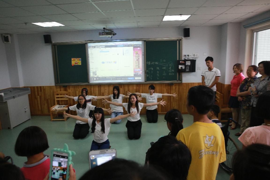 在院长的带领下,大家首先走进特殊教育学校。在这里,正为“六一”准备节目的儿童为大家表演了节目,赢得在场的每一位老师和同学的热烈掌声。接着由我校弘毅书院的学生献上事前准备好的舞蹈,并把这些简单的动作一对一地教给孩子们。他们积极配合,和我校老师同学们相处融洽,个个脸上都洋溢着甜甜的笑容。最后,于书记带领大家一起喊出:“六一”儿童节快乐。