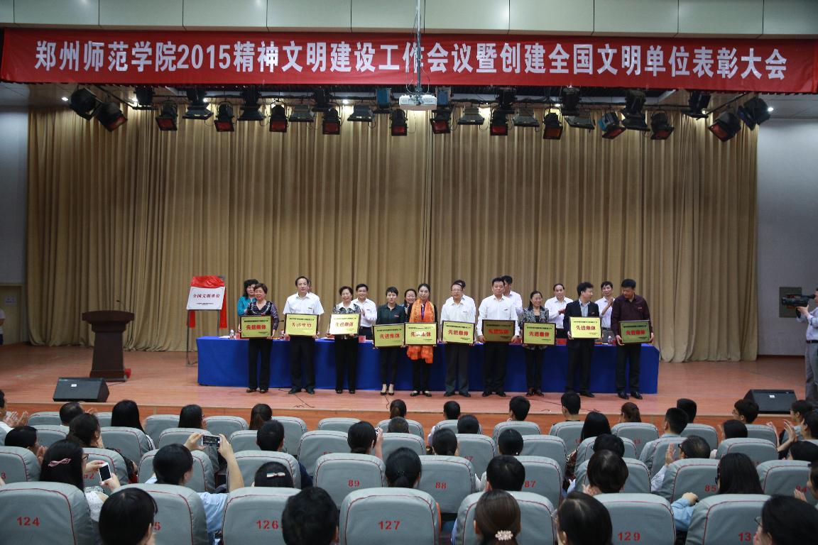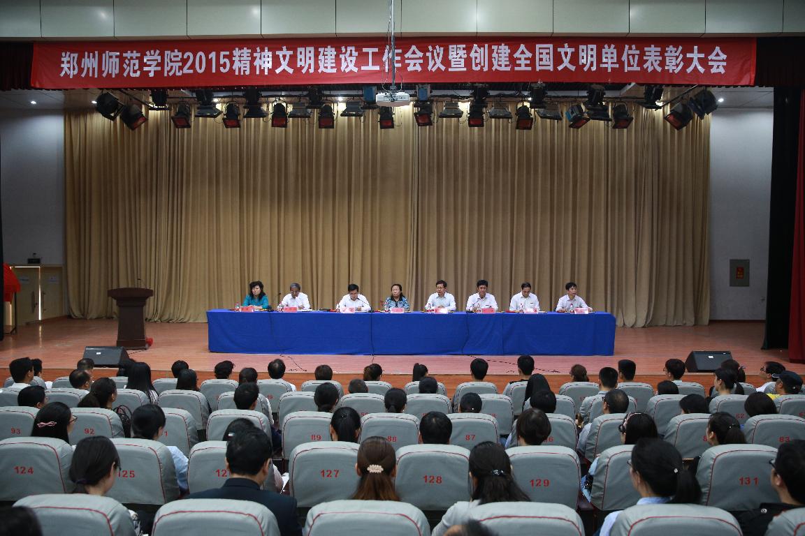 4月28日下午, 郑州师范学院2015精神文明建设工作会议暨创建全国文明单位表彰大会在7号楼报告厅举行。我校全体副科级以上干部、文明督导员、受表彰先进个人、先进班集体代表、志愿者代表500多人参加大会。大会由校党委副书记、工会主席弓民主持。