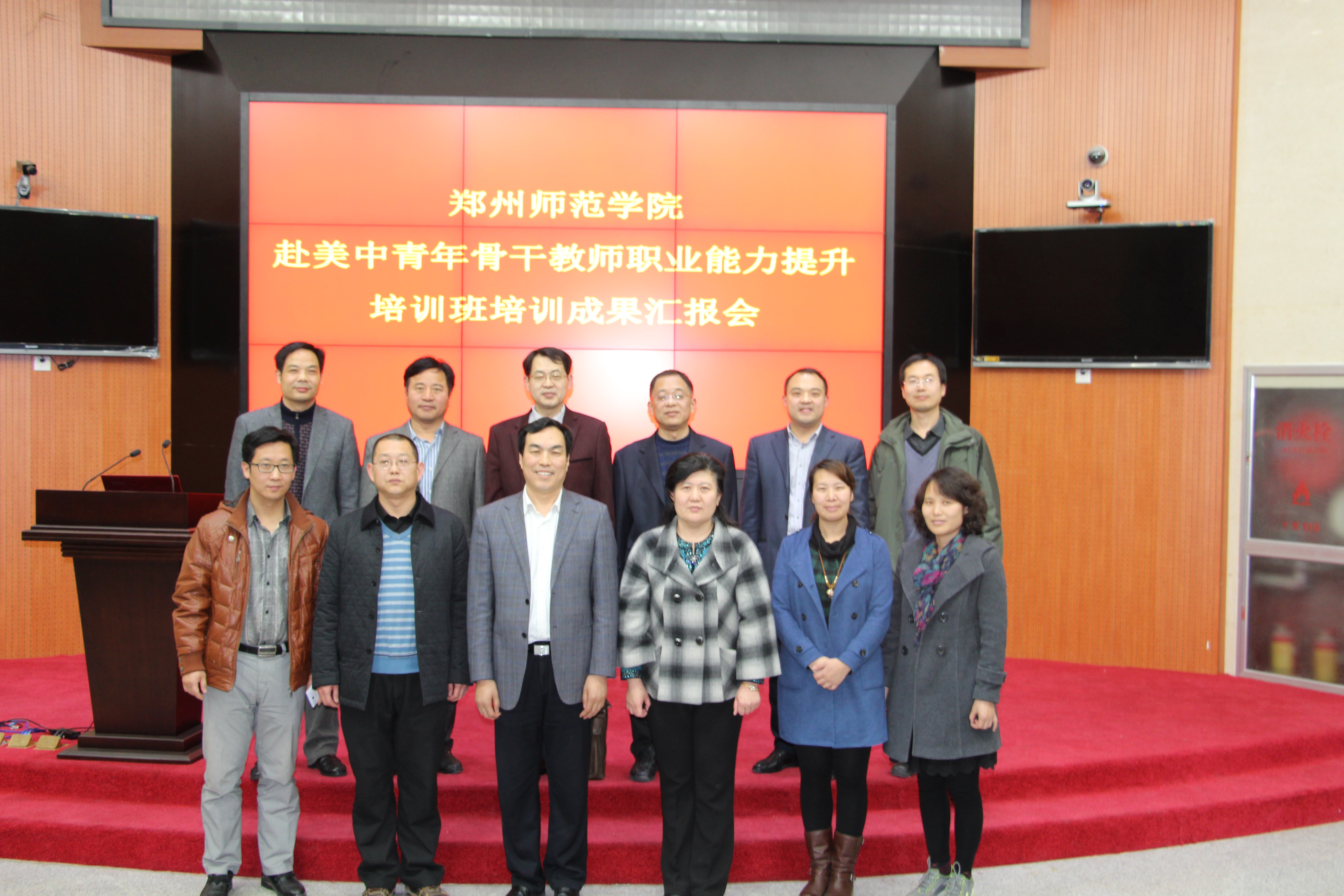 3月24日下午,我校召开赴美中青年骨干教师职业能力提升高级培训班培训成果汇报会,会议在东校区外语楼举行。郑州市人力资源和社会保障局出国培训管理处处长王剑、副校长蒋丽珠、全校各行政部门人员、各院教学秘书及教辅机构代表、国际合作与交流处工作人员参加了此次会议。