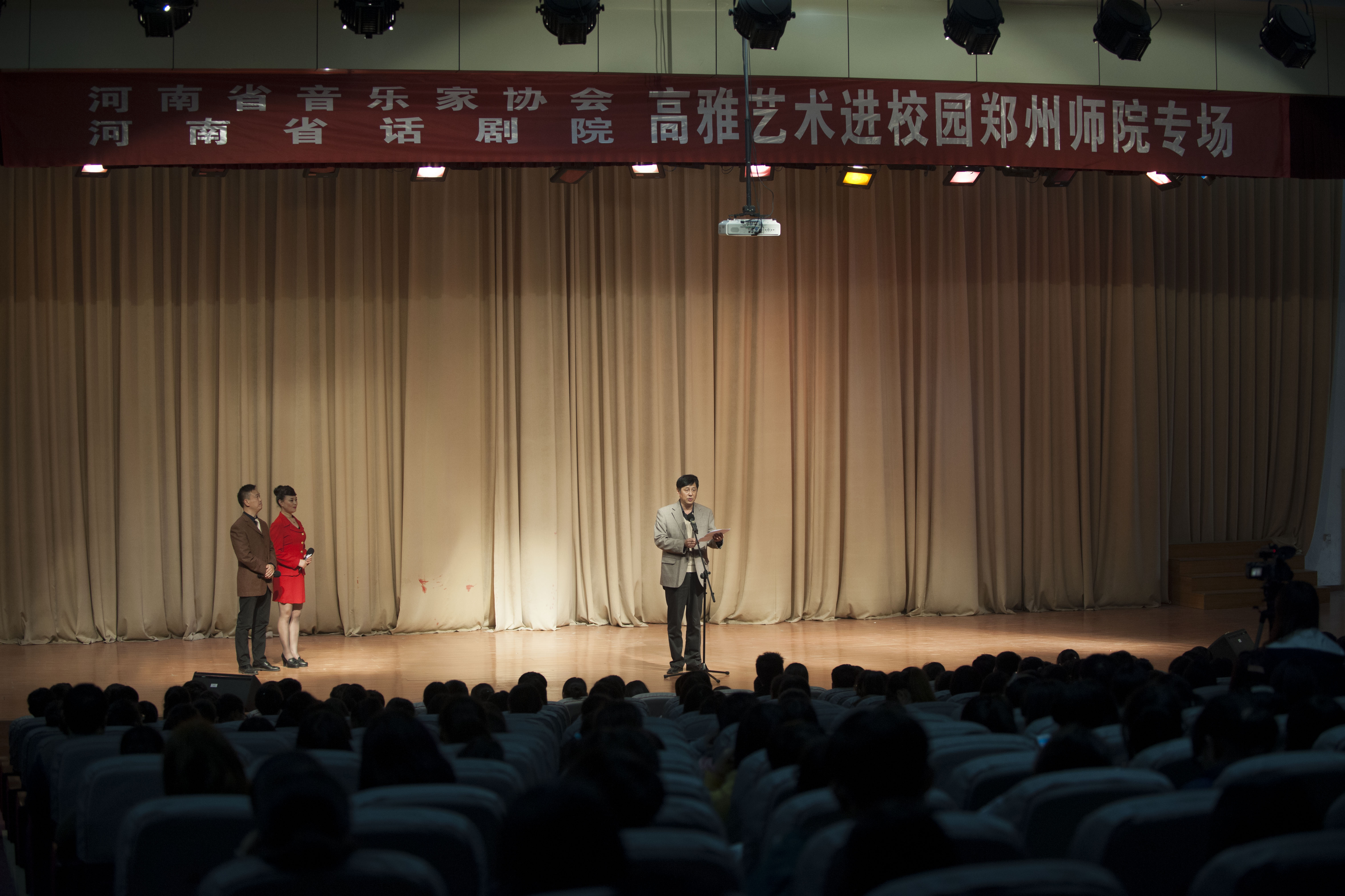 演出开始前,党委副书记、工会主席弓民发表讲话,代表师院师生员工向河南省京剧艺术中心的艺术家们表示诚挚的欢迎和衷心的感谢。他指出,“高雅艺术进校园活动”已成为普及优秀民族文化,让学生了解世界艺术经典、热爱中华文化的有效途径。这对进一步活跃我校的文化氛围、提升学生的艺术修养和文化素质具有积极而深远的意义。