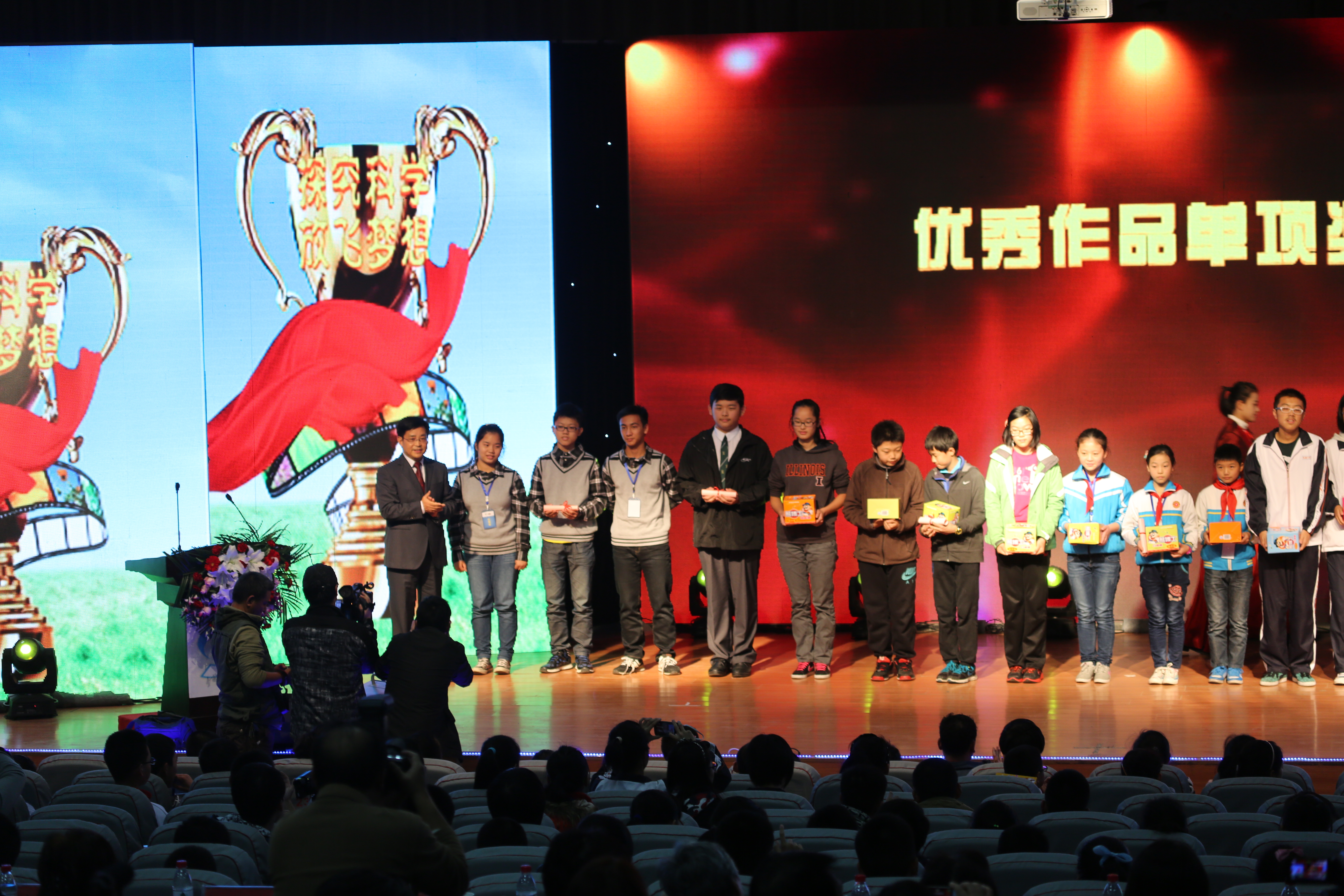 中国科协副主席、中国工程院院士、中国青少年科技辅导员协会理事长陈赛娟,中国科协青少年科技辅导员协会常务副理事长牛灵江,中国科协青少年科技中心副主任刘会强,河南省科协主席霍金花,广西科协副主席梁春花,以及河南省青少年科技中心、广西青少年科技中心等相关部门领导和东莞徐记食品有限公司相关负责同志参加展评活动并出席颁奖典礼,我校校长赵健,党委副书记、工会主席弓民出席活动。