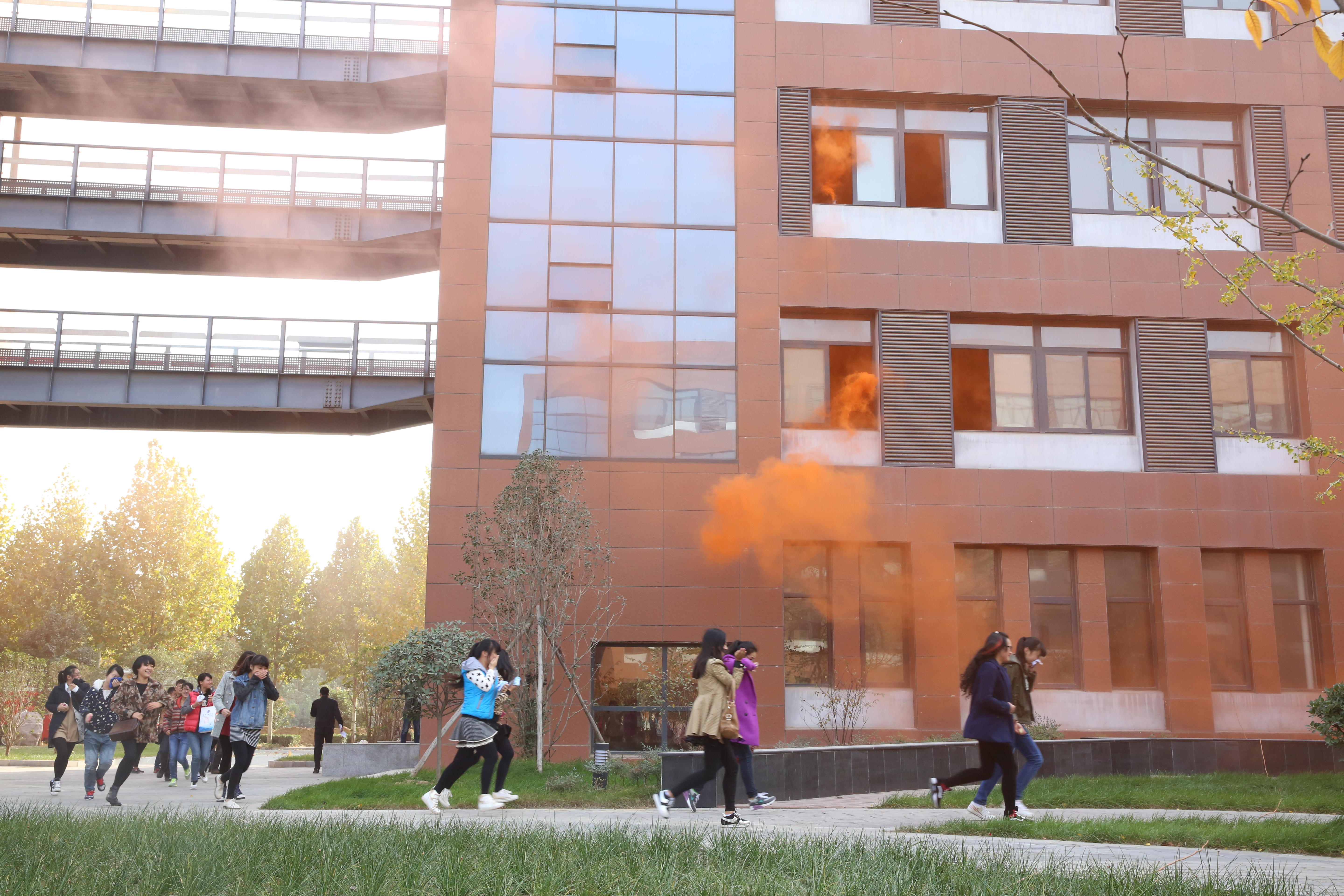 本次演练由消防知识宣讲、疏散逃生、云梯救困、高喷车出水控火、灭火演练五部分组成。在消防官兵讲解消防安全常识及演练注意事项后,综合演练正式开始。现场模拟火情发生、疏散应急预案迅速启动,公共教学楼管理员及时上报火情,使用楼内消防器材灭火;接报的保卫部门人员鸣响警笛,迅速赶赴现场,组织人员疏散;各楼层学生在引导员帮助下快速、有序撤离;消防官兵对因火势较大困在教学楼廊桥上的学生开展高空救援,并利用消防高喷车从教学楼外部控制火势蔓延;校医院工作人员做好现场急救保障;楼内所有人员撤至安全地带后清点人数迅速报告。