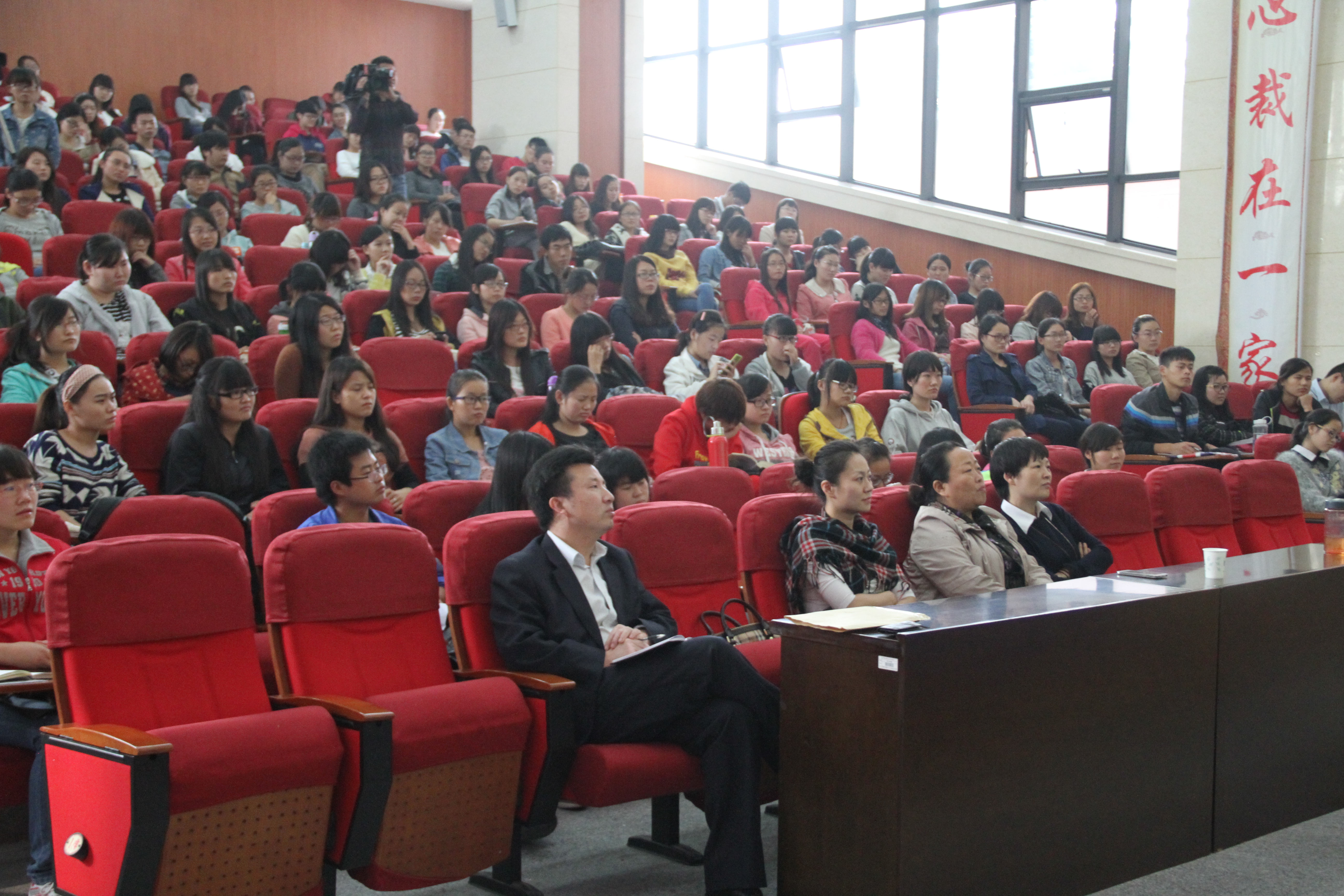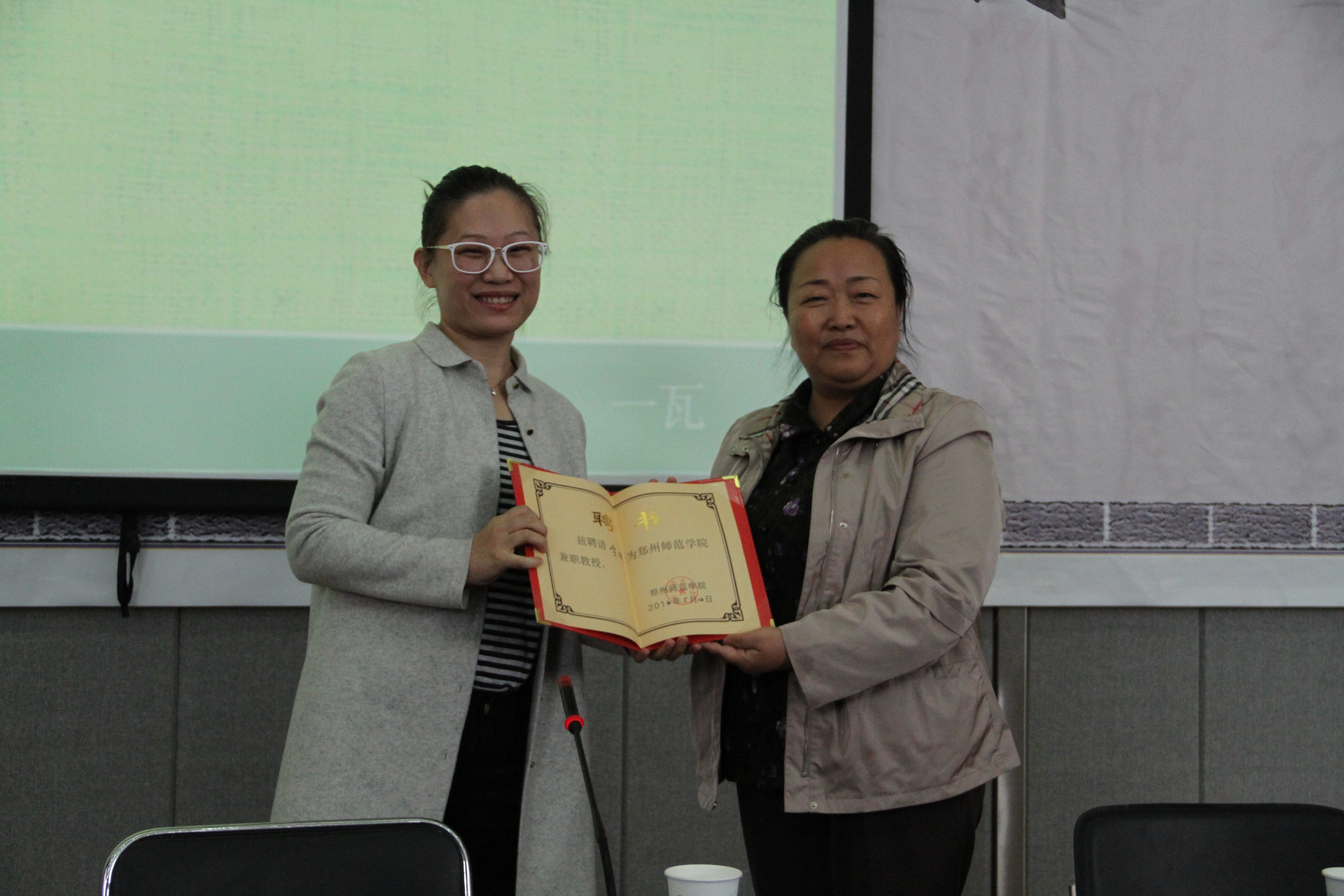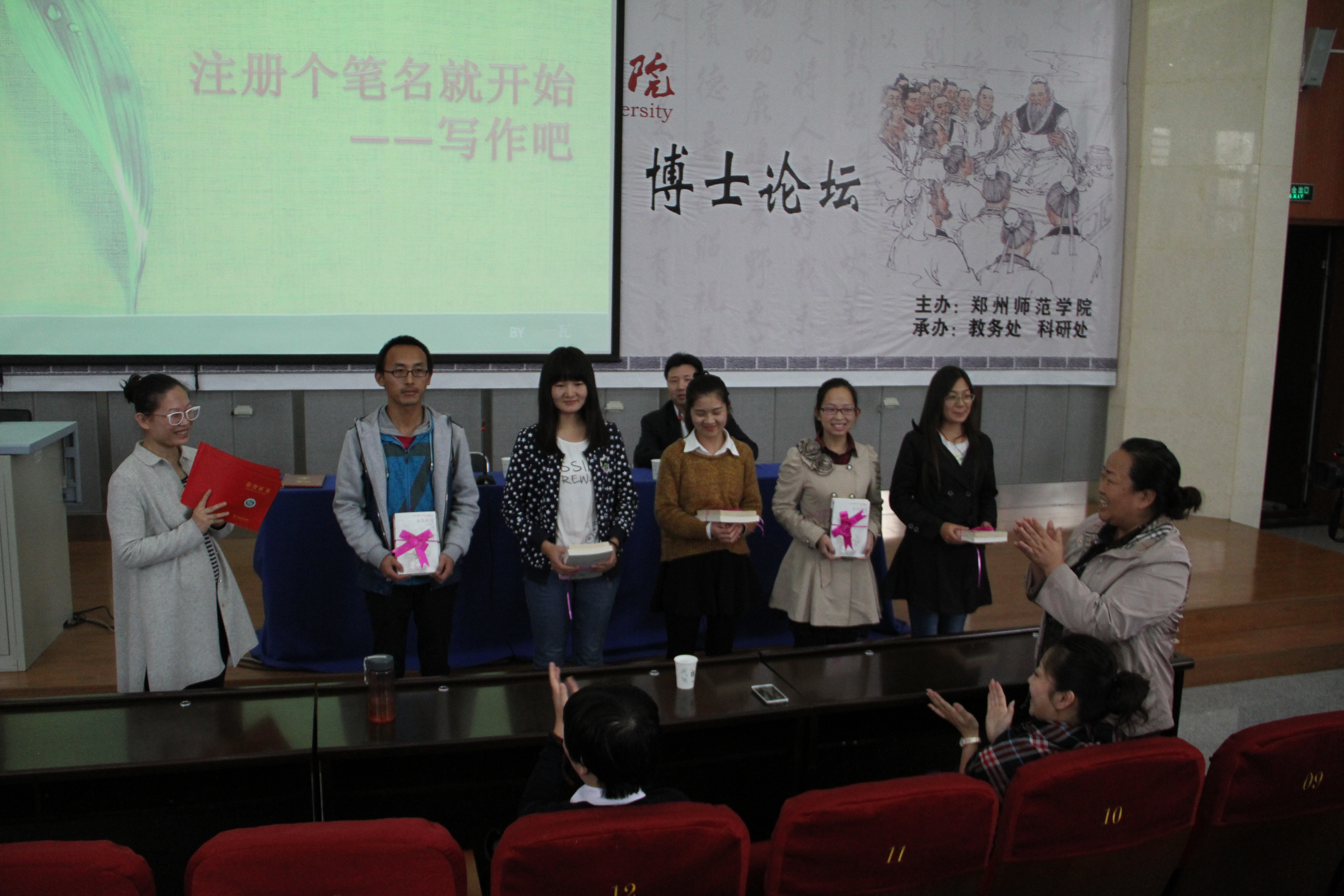 10月21日下午,网络作家一瓦老师在东校区综合楼A301教室为我校师生作了一场题为《注册个笔名就开始写作吧》的报告。校党委书记于向英、图书馆、文明办负责人等出席了本次报告会。报告会上于书记向一瓦老师颁发了郑州师范学院兼职教授聘书,一瓦老师向图书馆捐赠了自己的图书,并为我校2014年读书标兵颁奖。