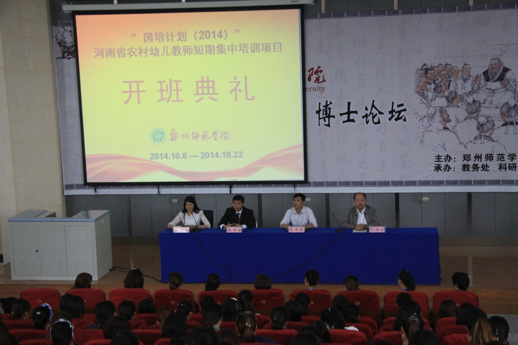 10月9日, “国培计划(2014)”——河南省农村幼儿教师短期集中培训项目第一期在我校东校区综合教学楼A301开班。副校长张建航、继续教育学院、教育科学学院负责人及来自全省的300余名学员参加了开班典礼。
