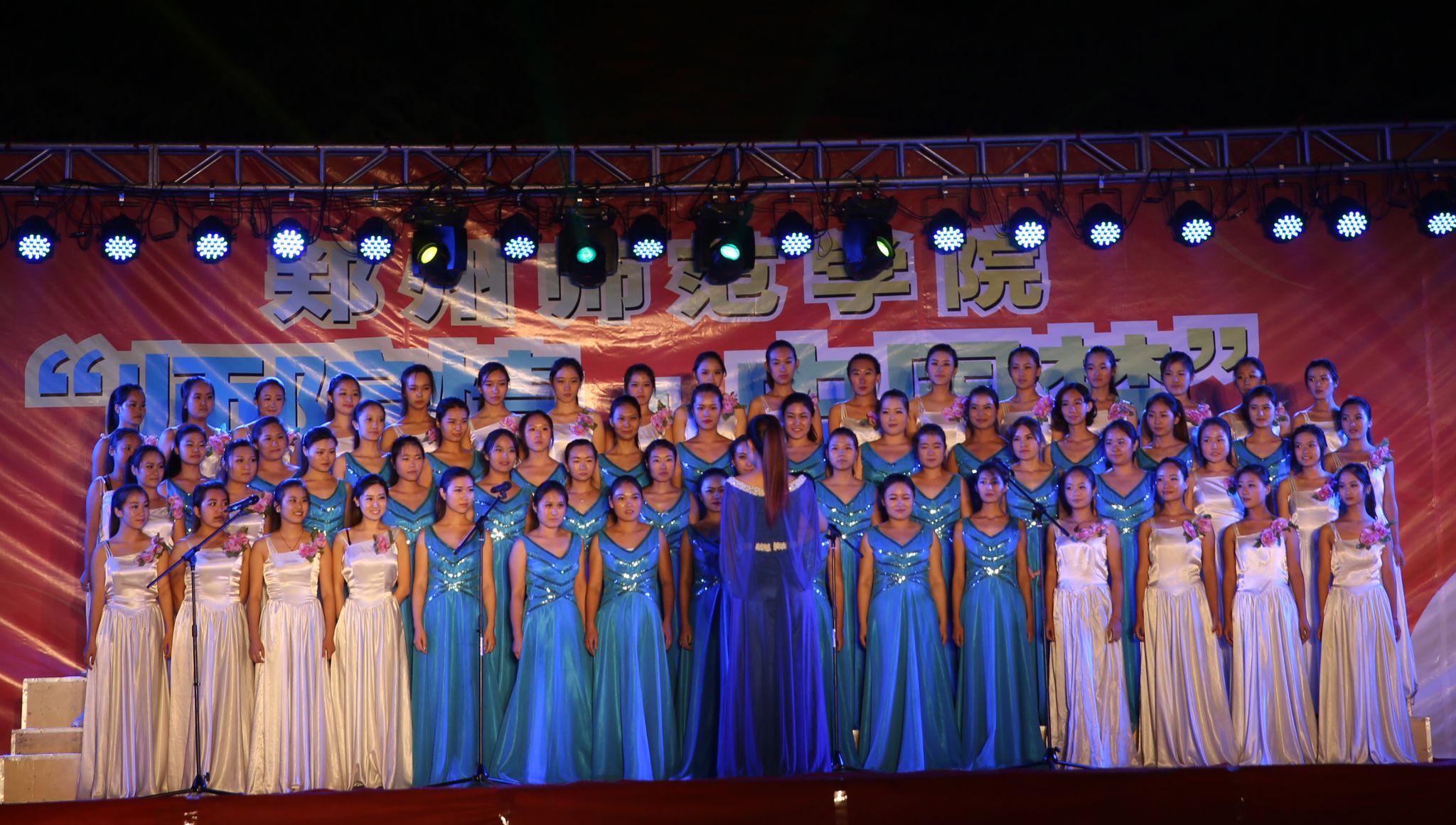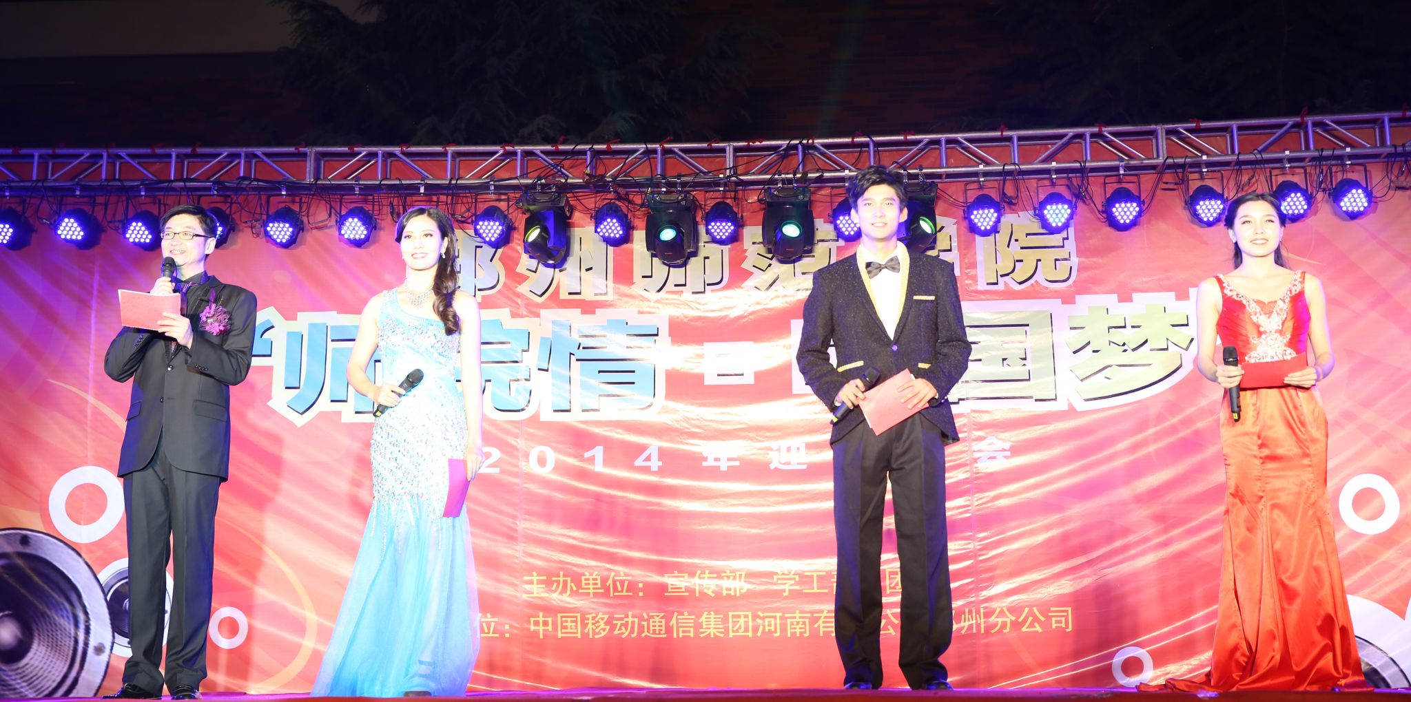 10月14日晚7点,由我校宣传部、 学工部、 团委主办的2014年“师院情 中国梦”迎新晚会在西校区艺术广场举行。出席此次晚会的领导有:党委书记于向英,校长赵健,党委副书记、工会主席弓民,副校长王北生,副校长张建航,副校长孔青,中科院研究员、博士生导师马润林。各行政部门负责人和各学院党总书记、院长、副书记以及近6000名师生观看了此次迎新晚会。