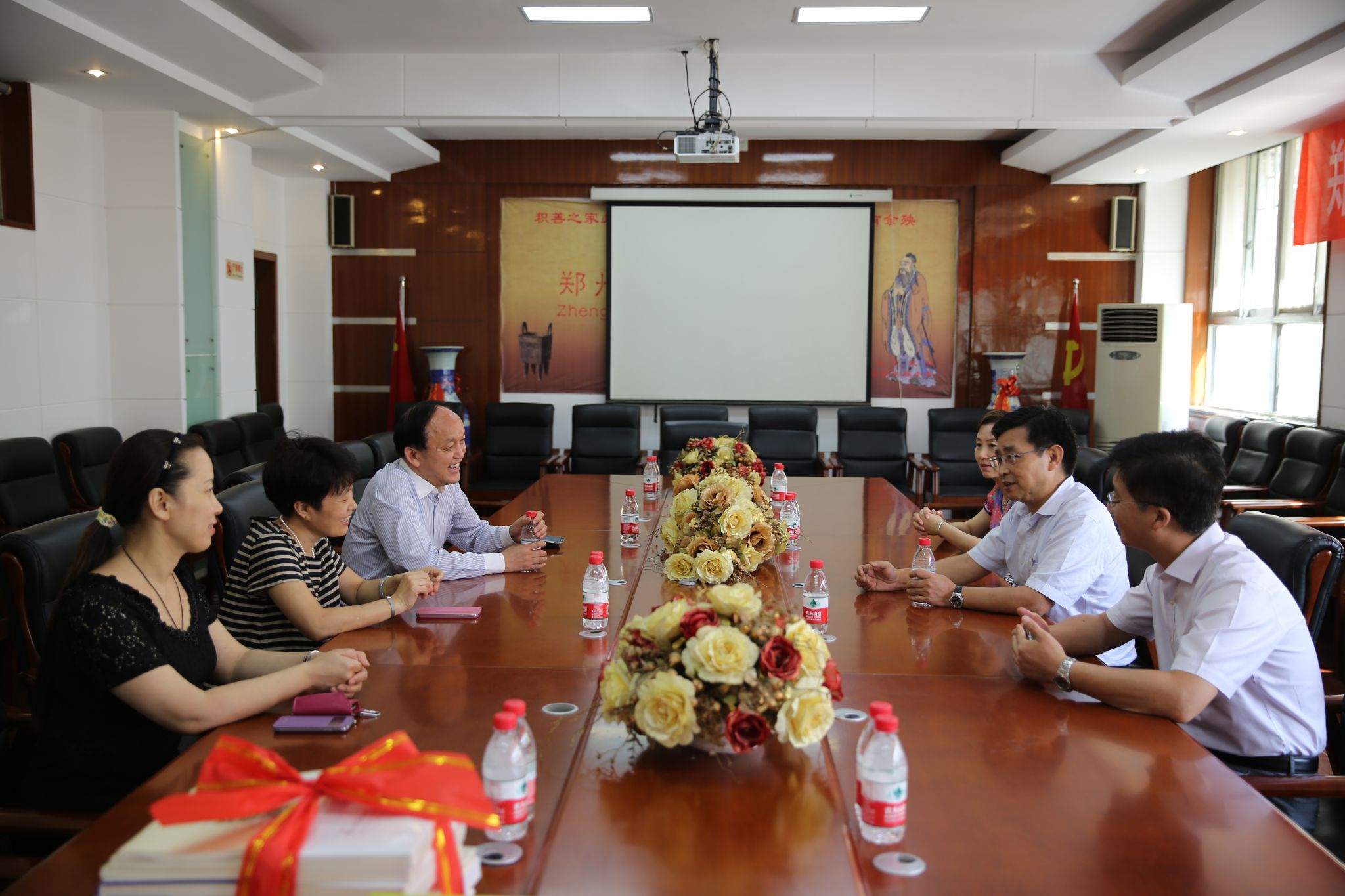 在第三十个教师节来临之际,校长赵健、副校长王北生、张建航在党政办、教务处负责同志的陪同下,分别来到河南省实验中学和我校附属小学、附属中学(郑州市第7中学)、附属外国语中学(郑州市第77中学)、附属实验中学(郑州市第79中学)等中小学,慰问广大教师向大家致以节日的问候,并向各附属中小学赠送了书籍等节日礼物。