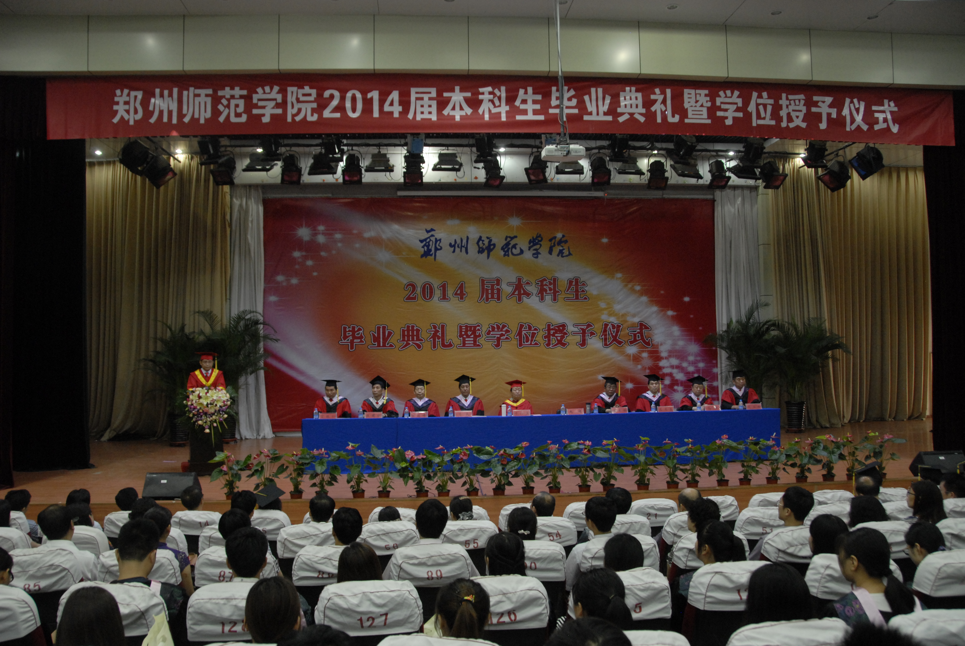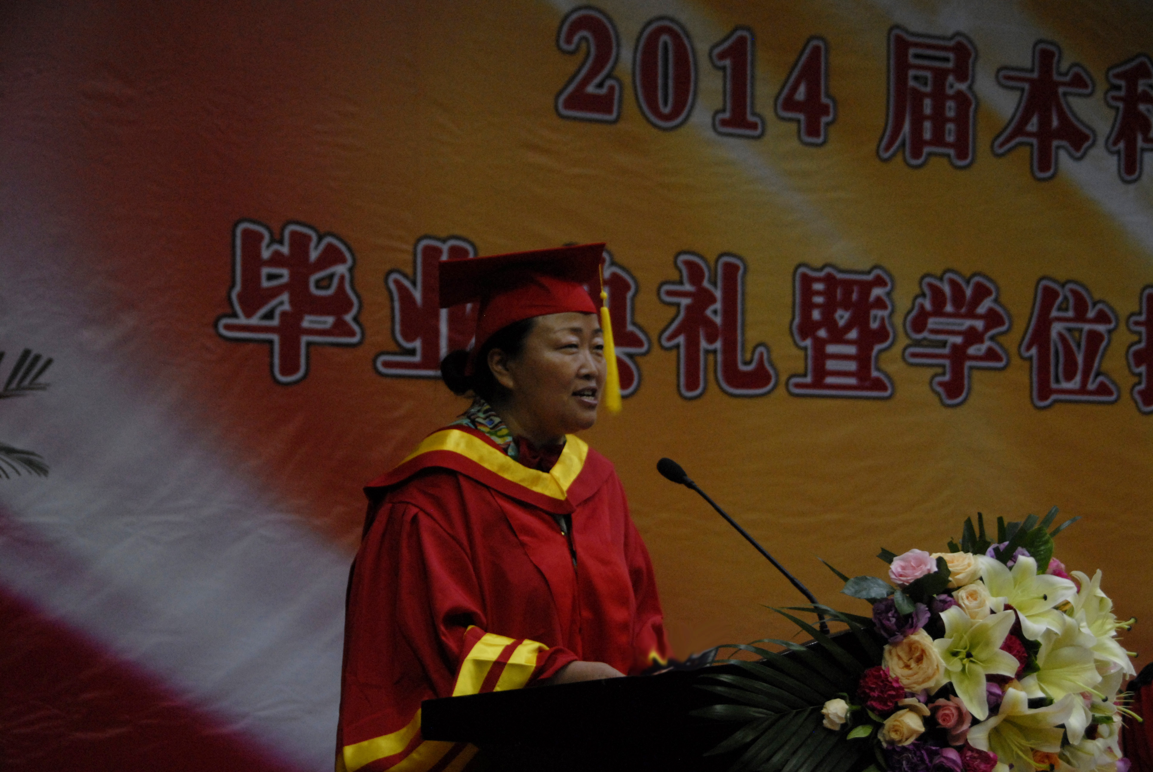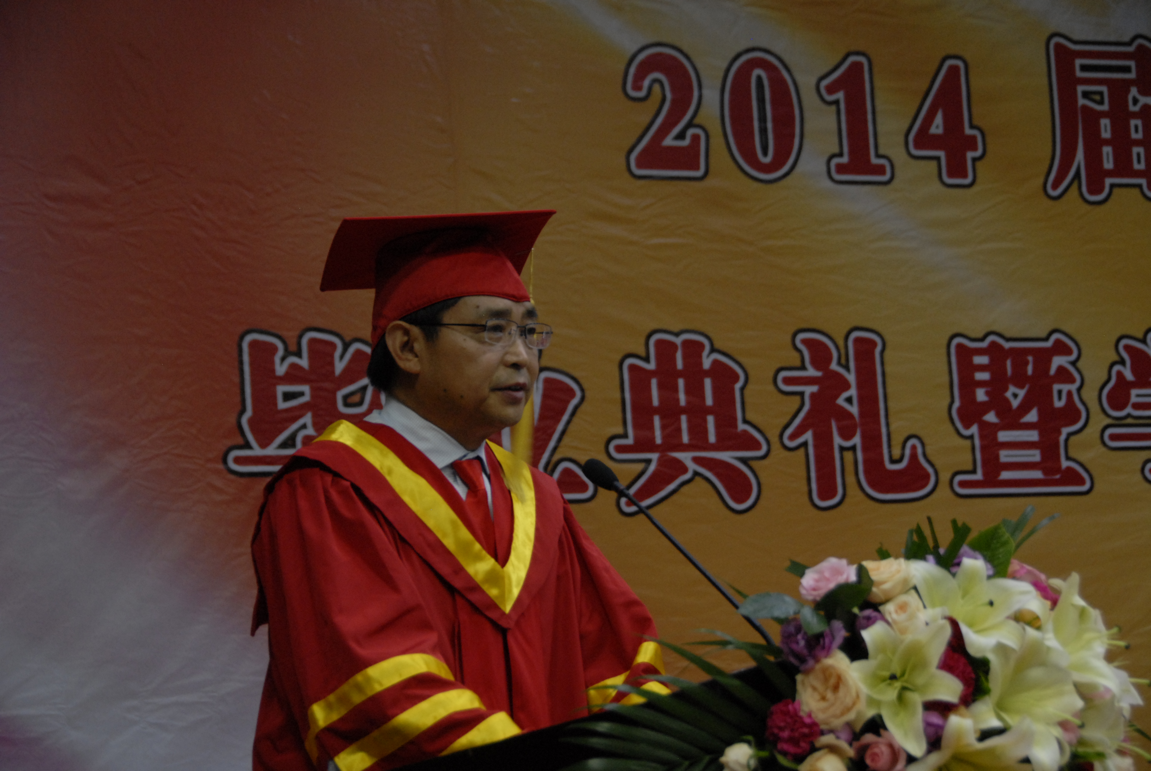 毕业典礼在雄壮激昂的国歌声中拉开帷幕。副校长王北生宣读了2014届本科毕业生学士学位授予决定。校长赵健发表重要讲话,他向顺利完成本科学业的莘莘学子致以祝贺,同时也提出了四点希望:希望同学们以自信迎接未来、不失进取之心、不忘平常之心、永怀感恩之心。仪式上毕业学生向教师代表献上鲜花以表达诚挚的谢意。党委书记于向英宣布2014届本科学士学位授予仪式开始,在庄重优美的《加冕进行曲》中,赵健校长为学士学位获得者授予学位证书。