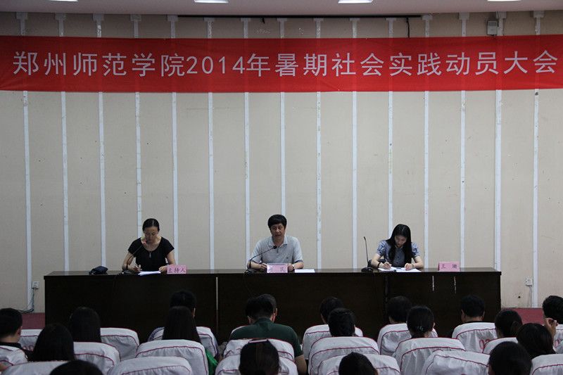 动员大会首先由团委副书记王珊宣读《郑州师范学院大学生社会实践活动规章制度》。随后,党委副书记、工会主席弓民宣读《中共郑州师范学院委员会关于开展2014年大学生暑期社会实践活动的通知》并为即将出发的同学做动员,指出今年大中学生暑期“三下乡”是以“建功‘四个河南’点亮青春梦想”社会实践教育活动为主题,是服务新农村与和谐社会建设的重要举措,强调了此次活动的重要意义并对这些即将远征的学生提出了几点要求:一、突出主题,强化服务、在社会实践活动中不断提高自身综合素质。二、健全机制、讲求实效、在社会实践活动中为广大群众提供扎实有效的服务。三、加强引导,育人为本、在社会实践中加强对学校的宣传,不断扩大活动的社会影响力。四、要切实加强组织工作,确保师生的人身安全。