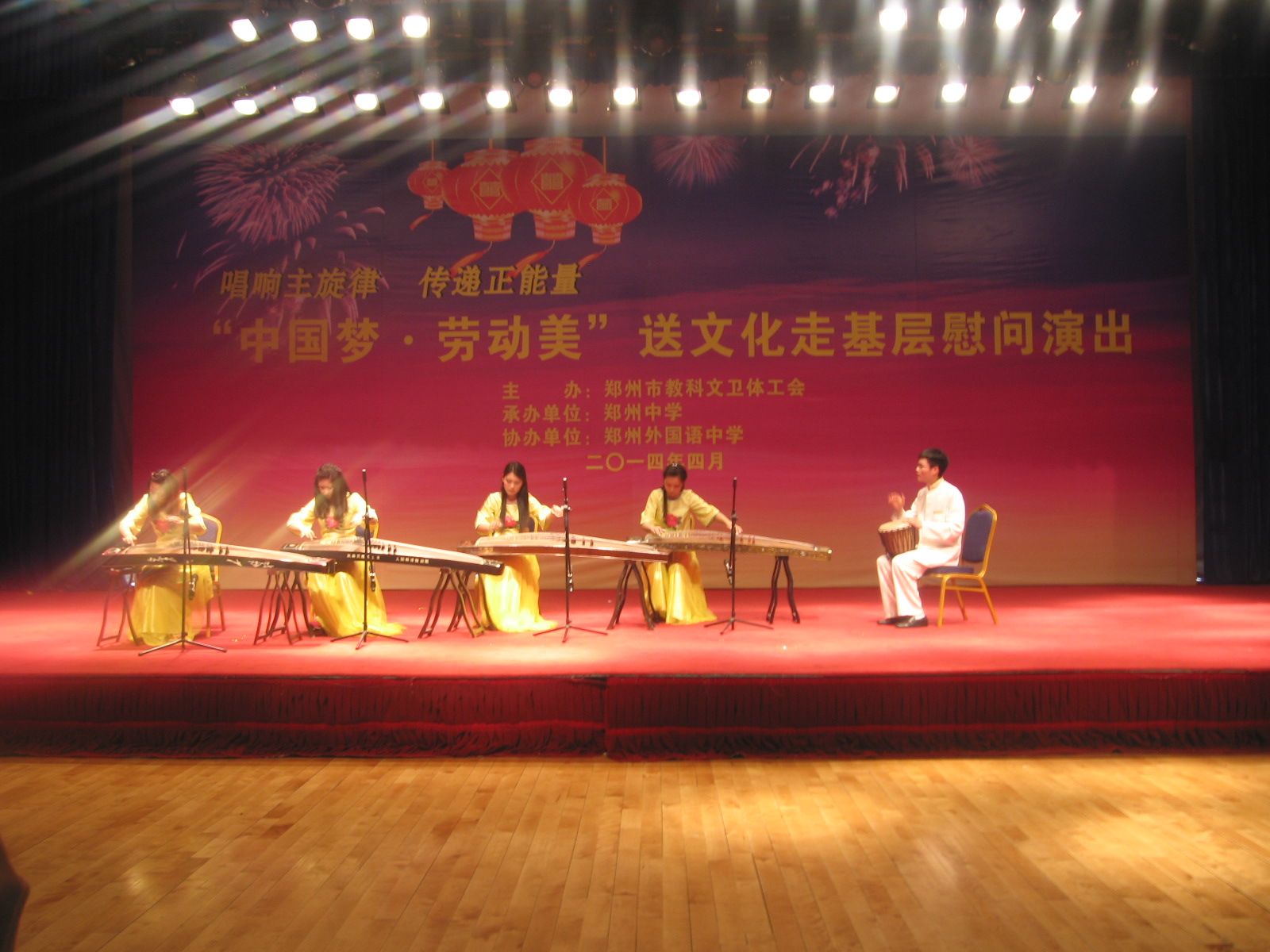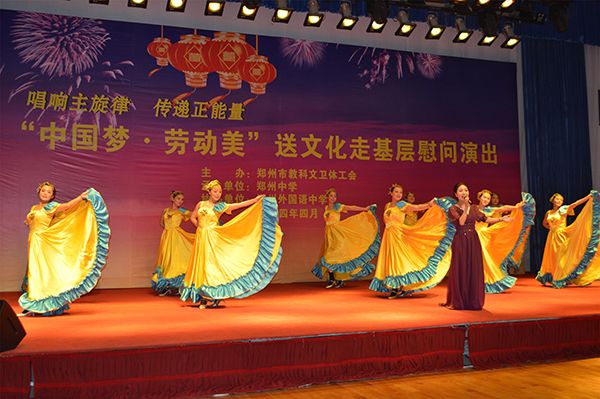 为深入学习贯彻党的十八大、十八届三中全会、中国工会十六大精神,在开展“强基层活力年”活动中,作为践行党的群众路线教育实践活动的具体行动,4月24日下午,我校选送的古筝四重奏《天山之歌》,参加了由郑州市教科文卫体工会主办、郑州中学承办、外国语中学协办的市工会组织送文化走基层——“中国梦·劳动美”大型慰问演出。